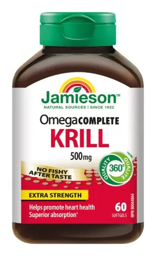 Jamieson Omega Complete Pure Krill obsahuje 500 mg čistého oleje z korýšů Euphausia superba v malých lehce polykatelných kapslích bez rybí pachuti. DHA přispívá k udržení normální činnosti mozku a k udržení normálního stavu zraku. EPA a DHA přispívají k optimální činnosti srdce.