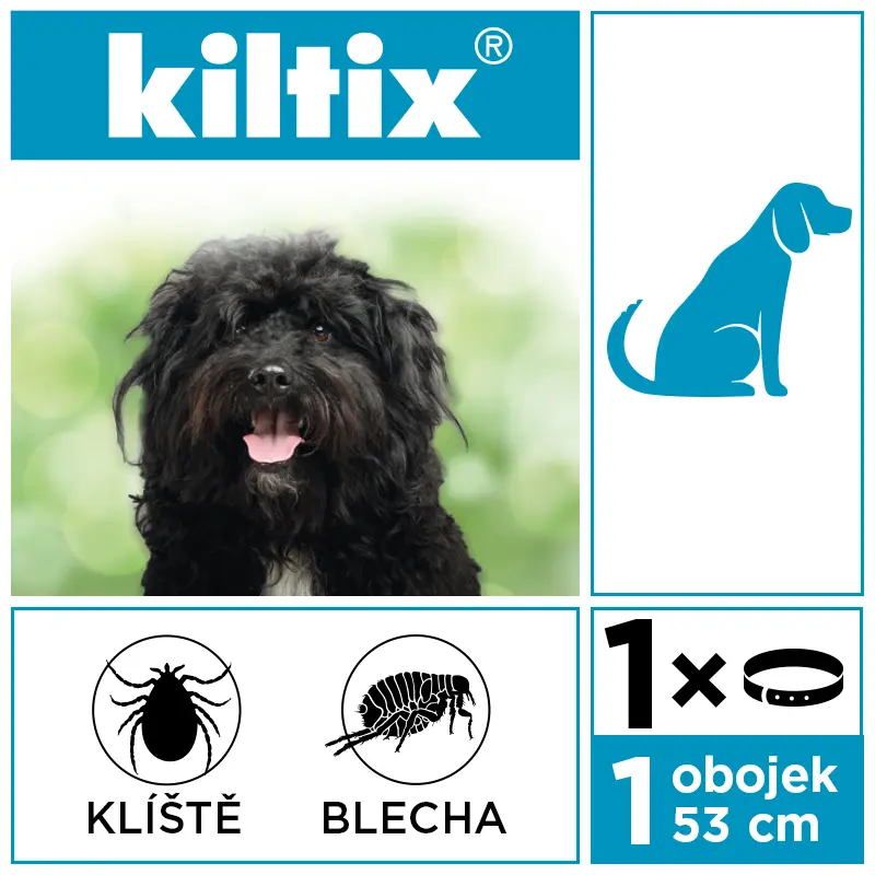 Kiltix obojek pro střední psy chrání Vašeho psa před napadnutím klíšťaty a blechami již 24 hodin po nasazení, až na 7 měsíců.