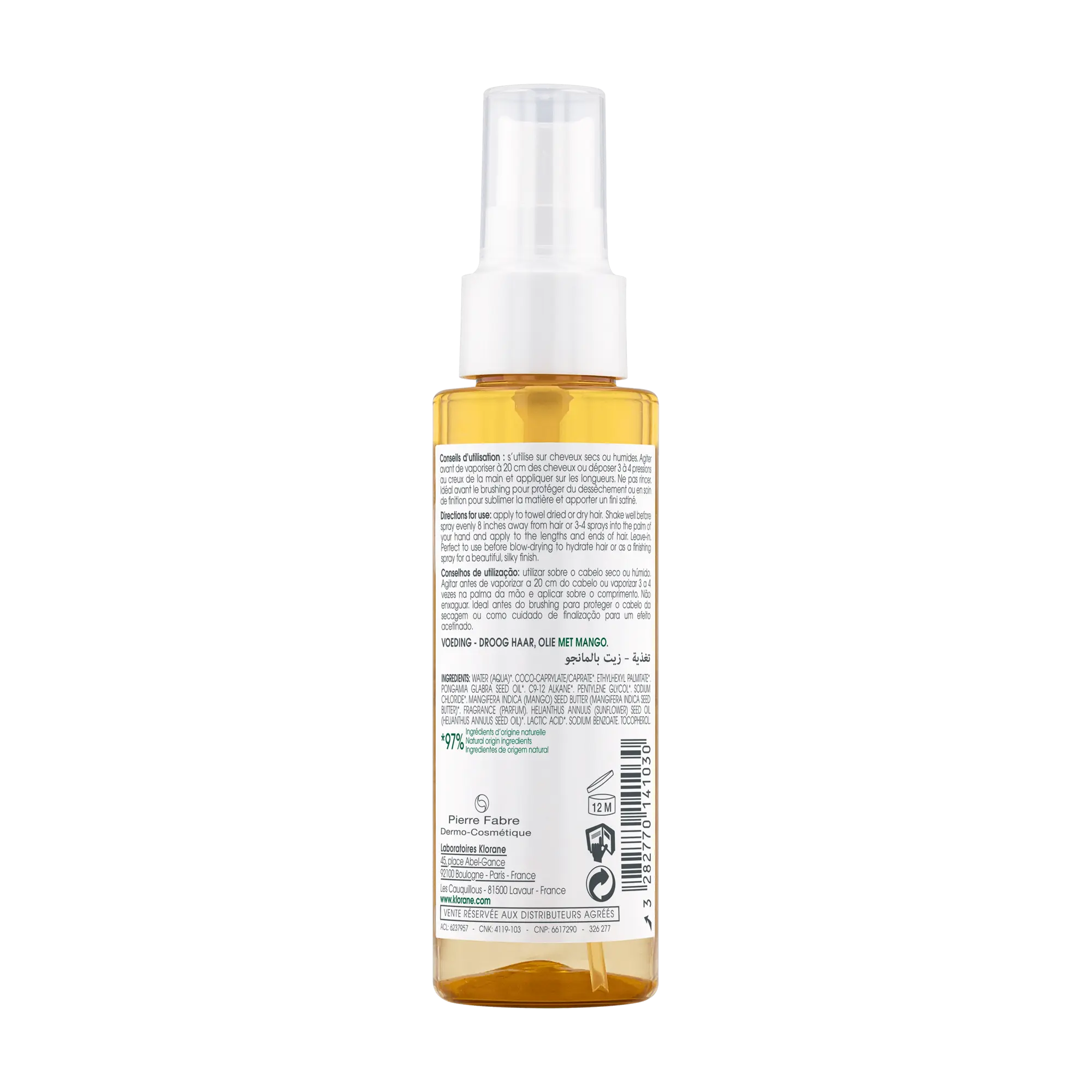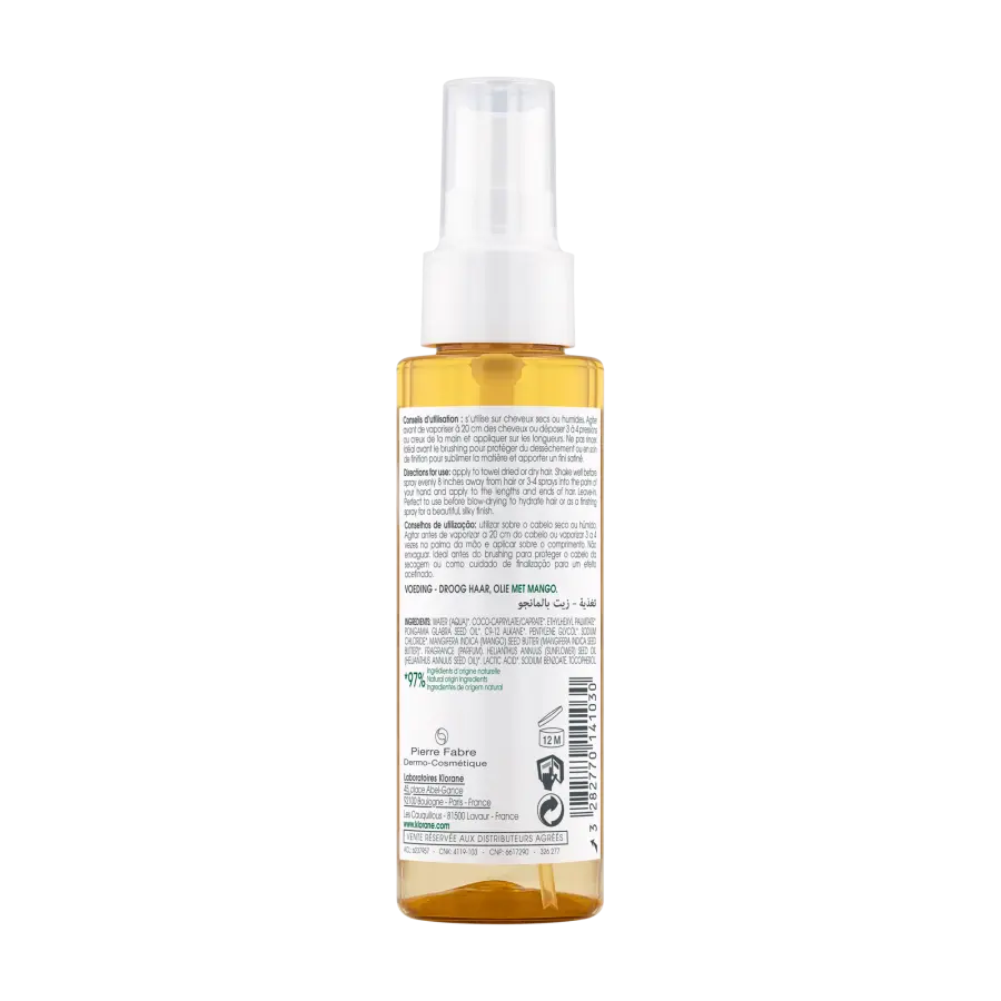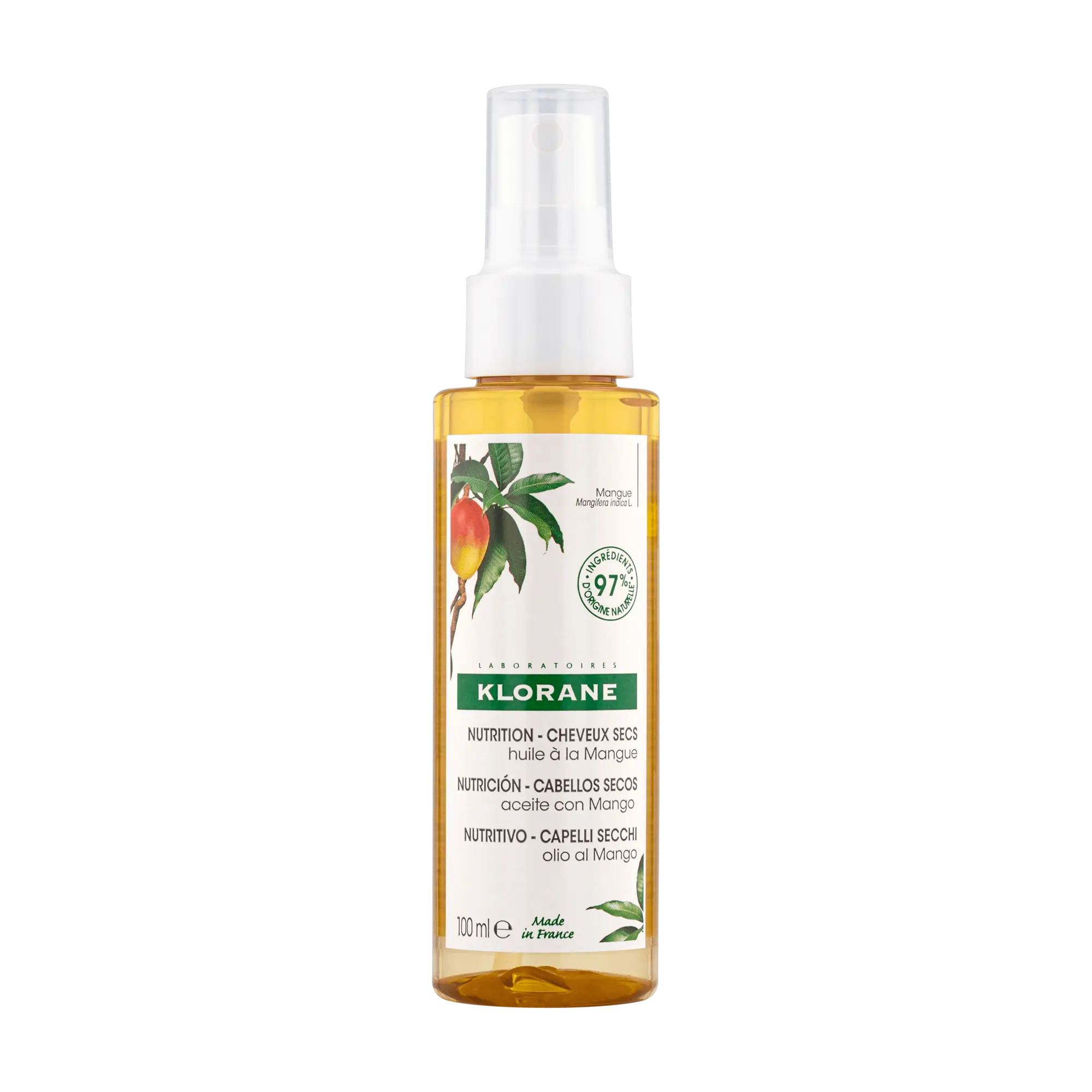Klorane Olej s mangem - vyživující pro suché vlasy okamžitě a dlouhodobě vyživuje suché vlasy, aniž by je zatěžoval, a to díky své lehké a vzdušné textuře. Sprej s mangovým olejem nastříkaný na suché nebo mokré vlasy, zejména na konečky, chrání vlasy před vnějšími vlivy a zabraňuje jejich vysoušení. Díky suché a bezoplachové aplikaci je ideální na pláž a poskytuje každodenní ochranu před škodlivými účinky slunce a vnějšími vlivy.