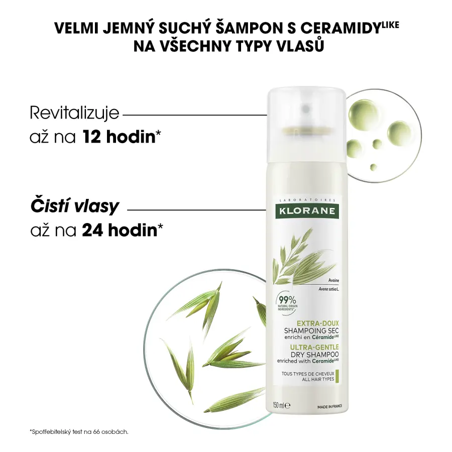 Klorane suchý šampon oves díky jedinečnému spojení zjemňujícího ovesného mléka a vysoce absorpčních pudrů myje vlasy bez použití vody, ve 2 minutách jim dodá objem a tvar. Prodlužuje trvanlivost účesu a snižuje četnost mytí vlasů. Je vhodný pro všechny typy vlasů a na časté použití.