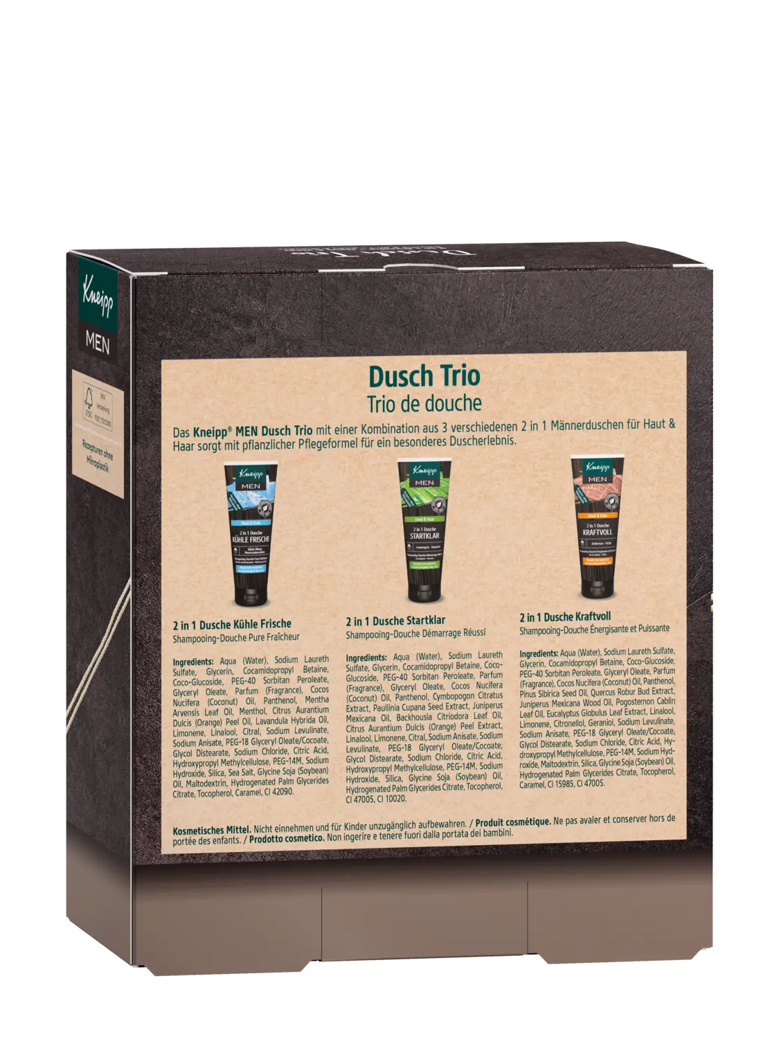 S dárkovou sadou Kneipp dárková sada Sprchové trio pro muže bude každý den jiný. Sprchové gely se díky praktické velikosti vejdou do každé tašky nebo batohu – ať už sportovní, nebo cestovní. V balení najdete hned tři různé sprchové gely 2v1, které se šetrně postarají jak o pokožku, tak vlasy. Obsah esenciálních olejů navíc zajišťuje dokonalou kombinaci vůně a péče.