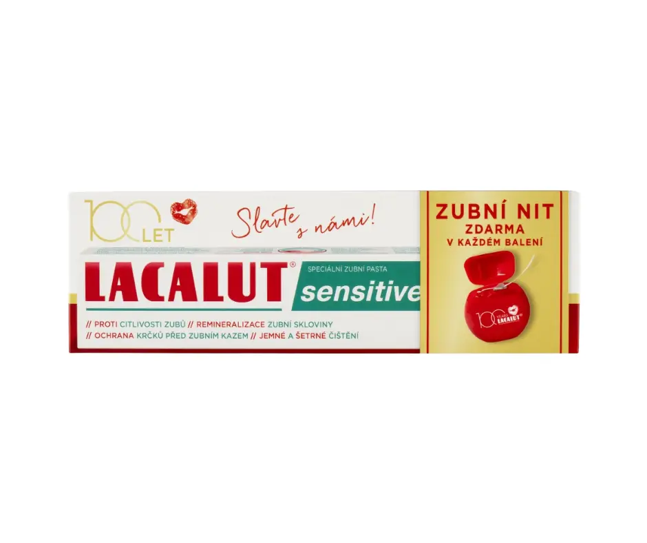 Lacalut zubní pasta Sensitive je určená pro citlivé zuby. Chrání citlivé zubní krčky před zubním kazem. Aluminium laktát, natriumfluorid a aminfluorid snižují citlivost obnažených zubních krčků, zabraňují vzniku kazu a působí na stažení dásní. Součástí balení je dentální nit zdarma.Jedná se o vysoce kvalitní, kompaktní dentální nit určenou pro použití na cestách. Díky malé a cestovní velikosti ji lze snadno nosit v kapse nebo kabelce, což zajišťuje pohodlnou péči o ústní hygienu kdekoli. Ideální pro udržování dentální hygieny na cestách, je účinná a stylová díky své červené barvě.