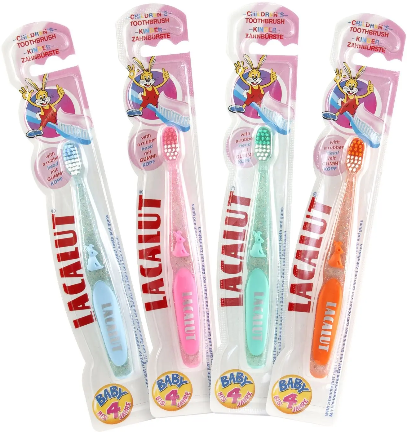 Lacalut dětský kartáček pro děti do 4 let byl vyvinut pro nácvik bezpečné a správné techniky čištění zubů. Má pogumovanou hlavici pro zabránění poranění nesprávnými pohyby kartáčkem při nácviku, ergonomicky tvarovanou rukojeť pro bezpečné uchopení kartáčku, protiskluzovou opěru na palec a extra jemné zaoblené štětiny.