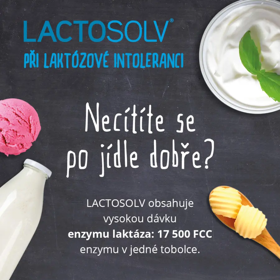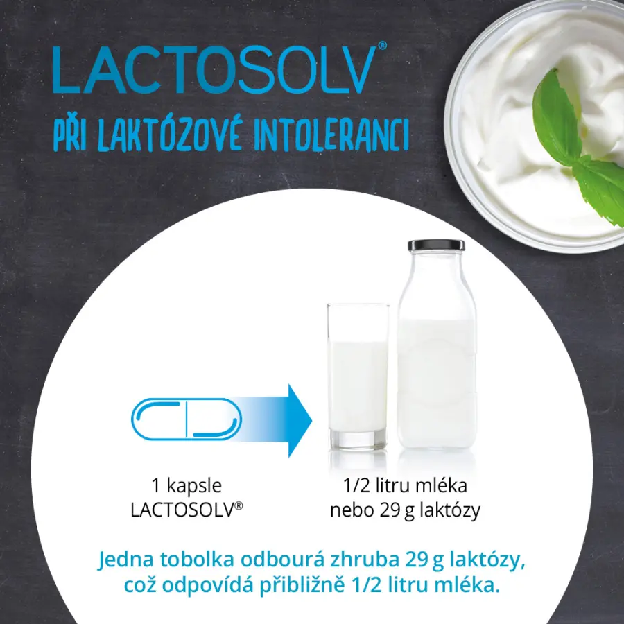 Lactosolv je doplněk stravy obsahující vysokou dávku enzymu laktázy. Přispívá k metabolizmu laktózy a usnadňuje tak strávení mléka a mléčných produktů při laktózové intoleranci. Enzym laktáza obsažený v doplňku stravy štěpí laktózu ve střevě na glukózu a galaktózu. Příjem potravin obsahujících laktózu je tedy možné usnadnit přirozenou cestou.