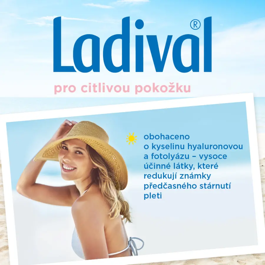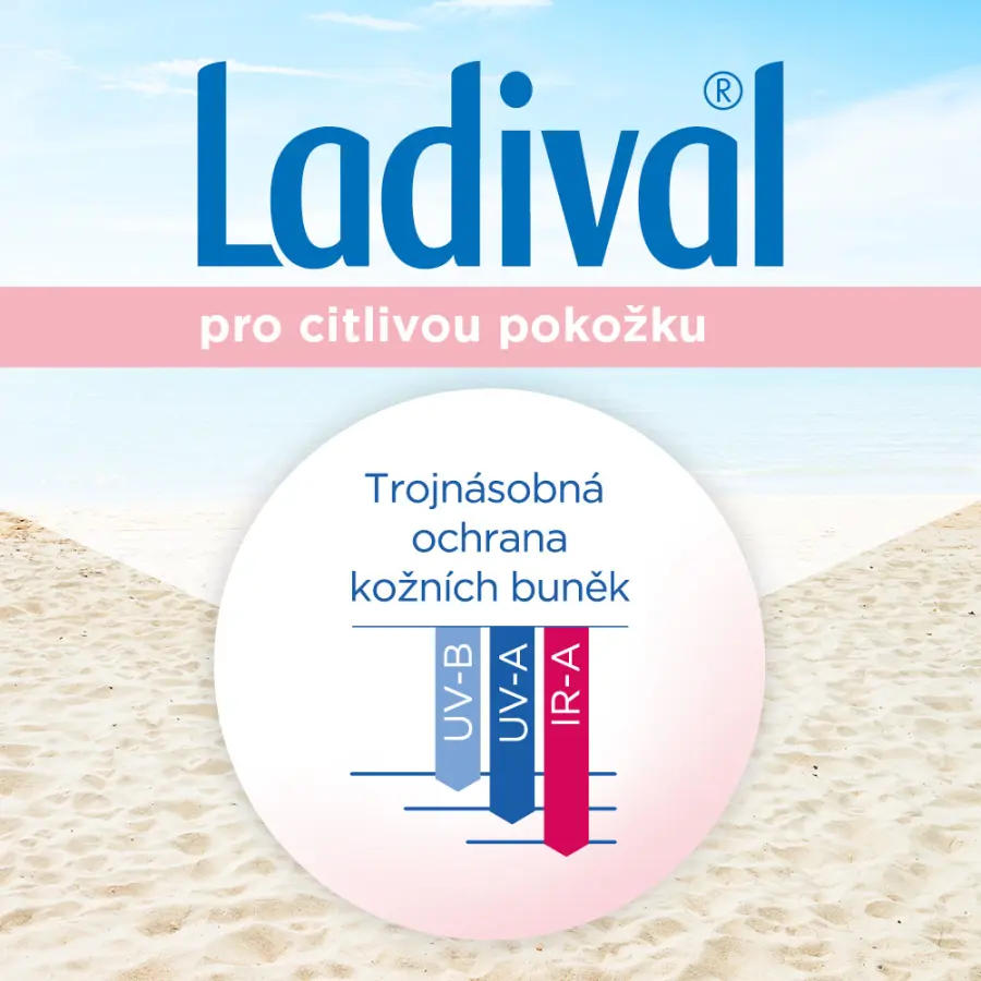 Ladival na ochranu před sluncem pro normální až citlivou pokožku nabízí speciální pečující složení pro ty, kteří chtějí svoji lehce citlivou pokožku uchovat zdravou. Produkt bezpečně a spolehlivě chrání pokožku při veškerých aktivitách, jako je pobyt ve vodě, procházka, sport nebo turistika. Sprej má lehkou konzistenci a obsahuje navíc komplex účinných látek z hyaluronu a fotolyázy. Fotolyáza je aktivní enzym z modrých řas, kerý podporuje vlastní regeneraci buněk pokožky a snižuje poškození kůže způsobené UVB zářením. Sprej je dermatologicky testován a je voděodolný. Neobsahuje PEG emulgátory, parfémy, silikonové ani minerální oleje.