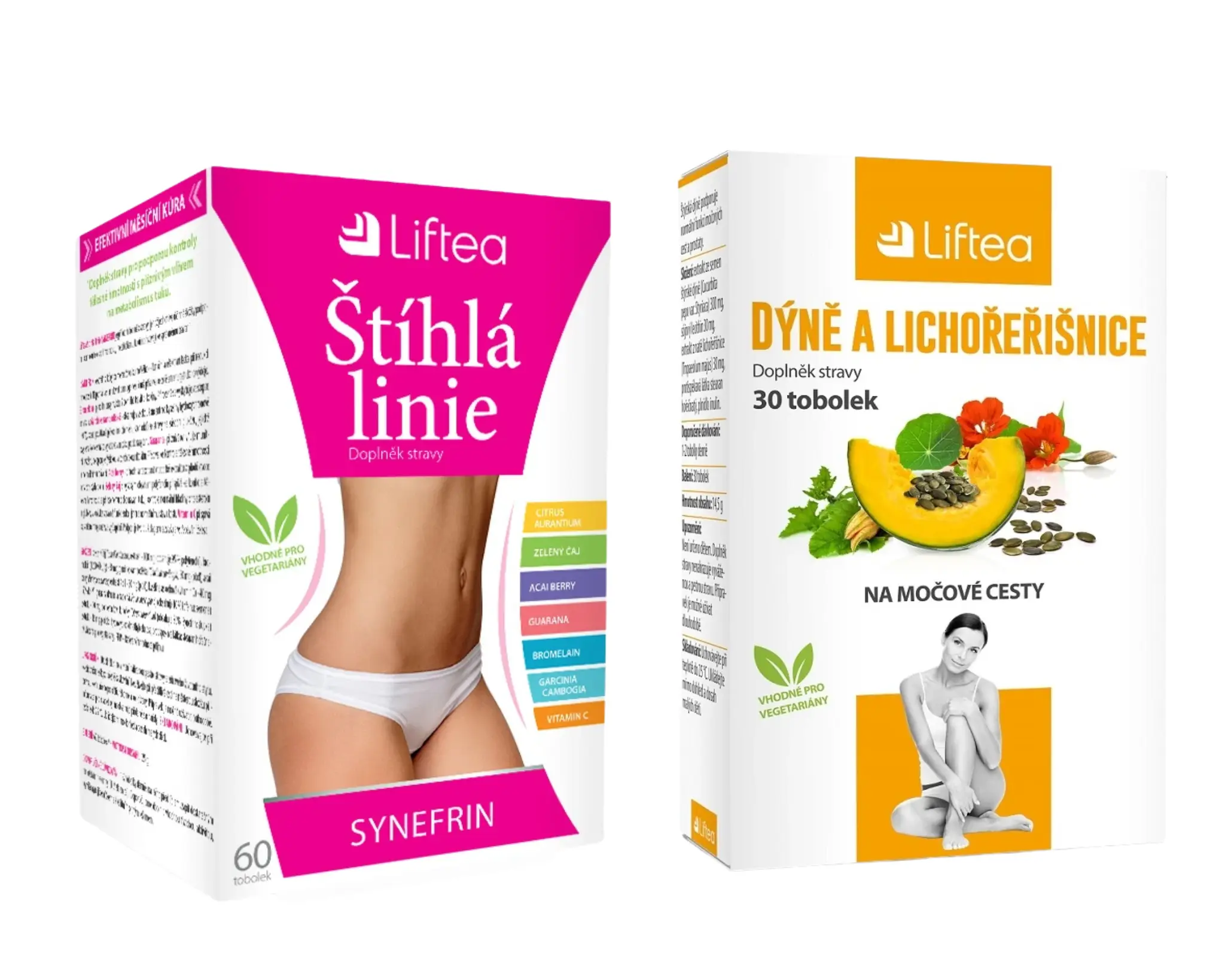 Výhodná sada dvou doplňků stravy Liftea zaměřená na podporu kontroly tělesné hmotnosti, trávení a normální funkce močových cest a prostaty.