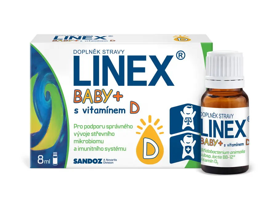 Linex® Baby+ kapky jsou vhodné pro děti již od narození pro doplnění probiotických bakterií a potřebného vitamínu D3. Linex® Baby+ obsahuje probiotický kmen užitečných bifidobakterií B. animalis subsp. lactis BB-12®, který pomůže k podpoře rovnováhy střevního mikrobiomu.Navíc obsahují vitamín D3, nezbytný pro posílení imunitního systému, pro zdravé kosti a zuby. Vitamín D3 je prospěšný také pro normální funkci svalů.