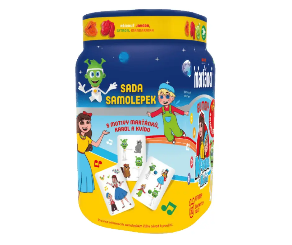 Želatinový multivitamin s obsahem vitaminů C, D3 a A pro podporu imunity a zdravého rozvoje dětí. Nové tvary Marťánků, Karol a Kvída a sada SAMOLEPEK NAVÍC. Lahodné ovocné příchutě. Bez umělých barviv, sladidel a konzervantů.