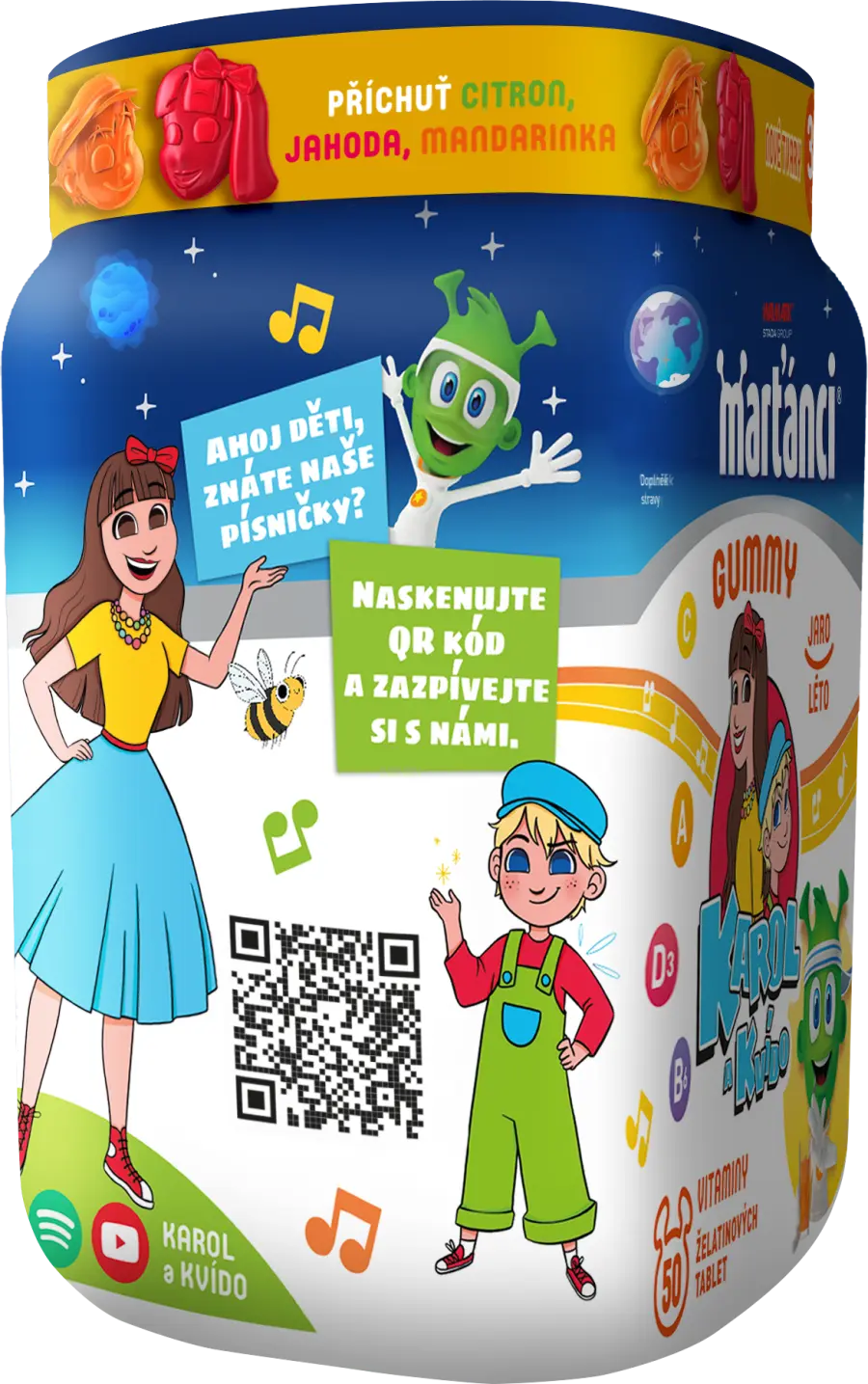 Želatinový multivitamin s obsahem vitaminů C, D3 a A pro podporu imunity a zdravého rozvoje dětí. Nové tvary Marťánků, Karol a Kvída a sada TETOVAČEK NAVÍC. Lahodné ovocné příchutě. Bez umělých barviv, sladidel a konzervantů.
