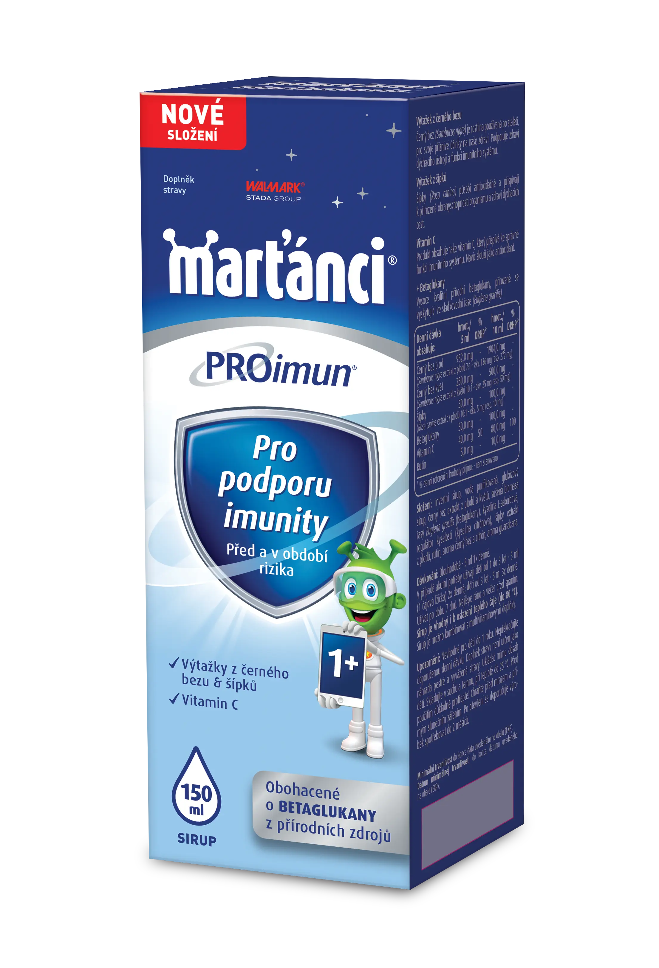 Marťánci PROimun sirup je doplňek stravy, který obsahuje směsi bylinných extraktů s výtažky z černého bezu, šípků a s vitaminem C pro podporu funkce imunitního systému.