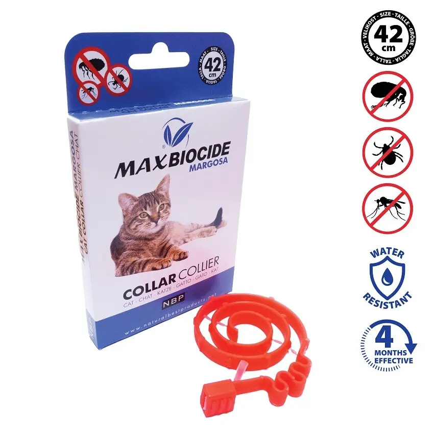 Max Biocide Cat Collar obojek pro kočky dlouhodobě působící proti blechám, klíšťatům a komárům. Vhodný i pro zvířata citlivá na chemické repelenty. Působí na bázi rostlinného extraktu z margosy – látky z tropického stromu zederachu indického, která má repelentní a biocidní účinky. Obliba této látky roste, protože je vhodný i pro zvířata, která jsou citlivá na chemické repelenty, navíc nedráždí jejich čich. Účinek obojku se projevuje již 3 hodiny po nasazení. Je voděodolný a chrání Vaši kočku minimálně po dobu 4 měsíců. Obojek nezanechává chemickou stopu v přírodě. Na antiparazitní přípravky a obojky Max Biocide se nevytváří resistence. Vhodné i pro březí kočky a koťata již od 2 měsíců věku.