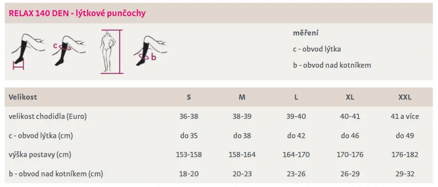 Dokonale jemnépodpůrné punčochy RELAX 140 DEN se silnějším svěrem v hladkémprovedení jsou určeny pro ženy ke každodennímu nošení (vhodné např. i při delšímsezení a stání nebo při cestování). Obsahují speciální úpravu HIGH IQ, kterázabezpečuje větší odvod vlhkosti (potu) od těla.