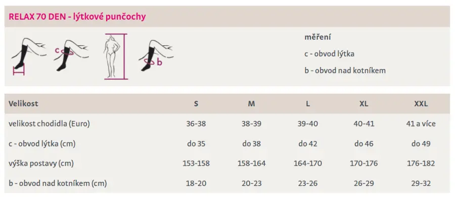Podpůrné punčochy RELAX 70 DEN s jemnýmsvěrem v hladkém provedení jsou určeny pro ženy ke každodennímu nošení (vhodnénapř. i při delším sezení a stání, při cestování, před menstruací apod.).Obsahují speciální úpravu HIGH IQ, která zabezpečuje větší odvod vlhkosti (potu)od těla.