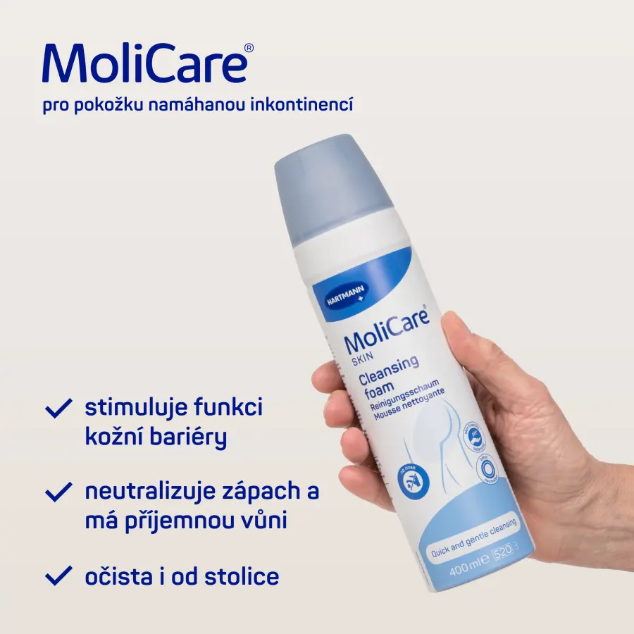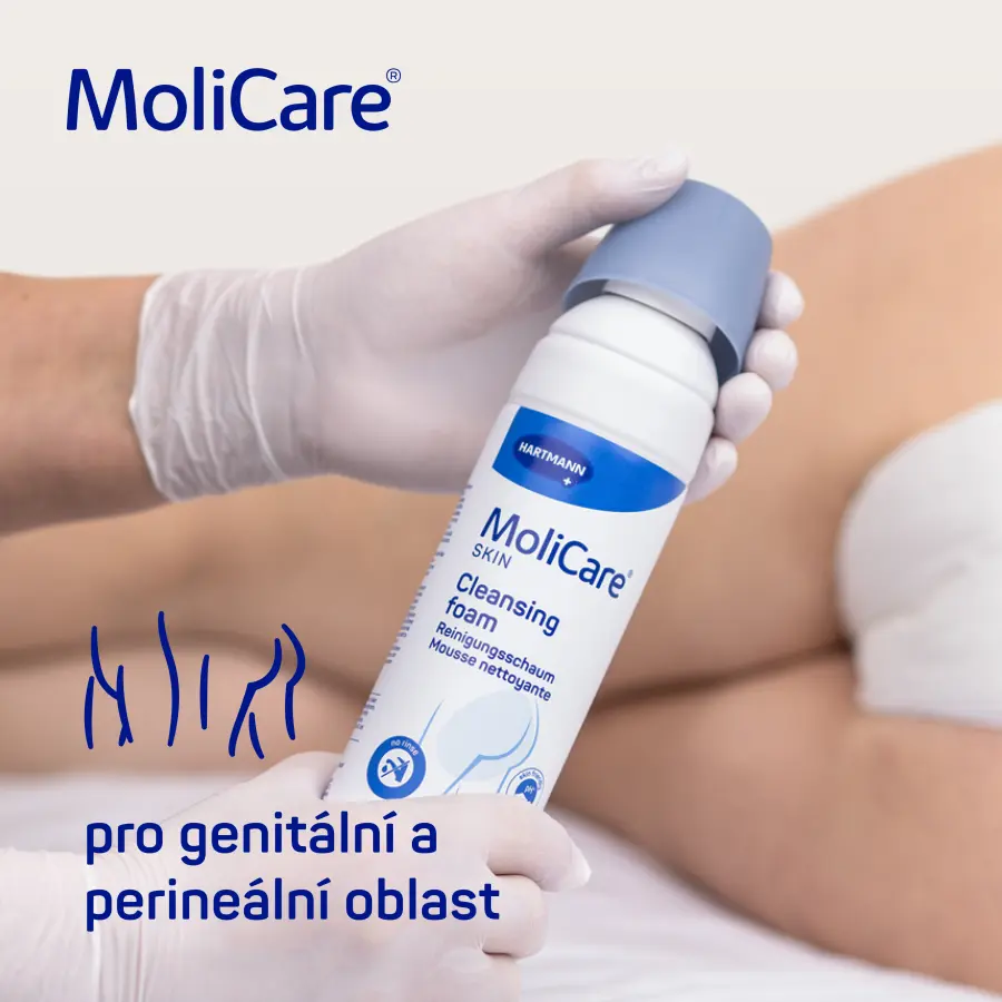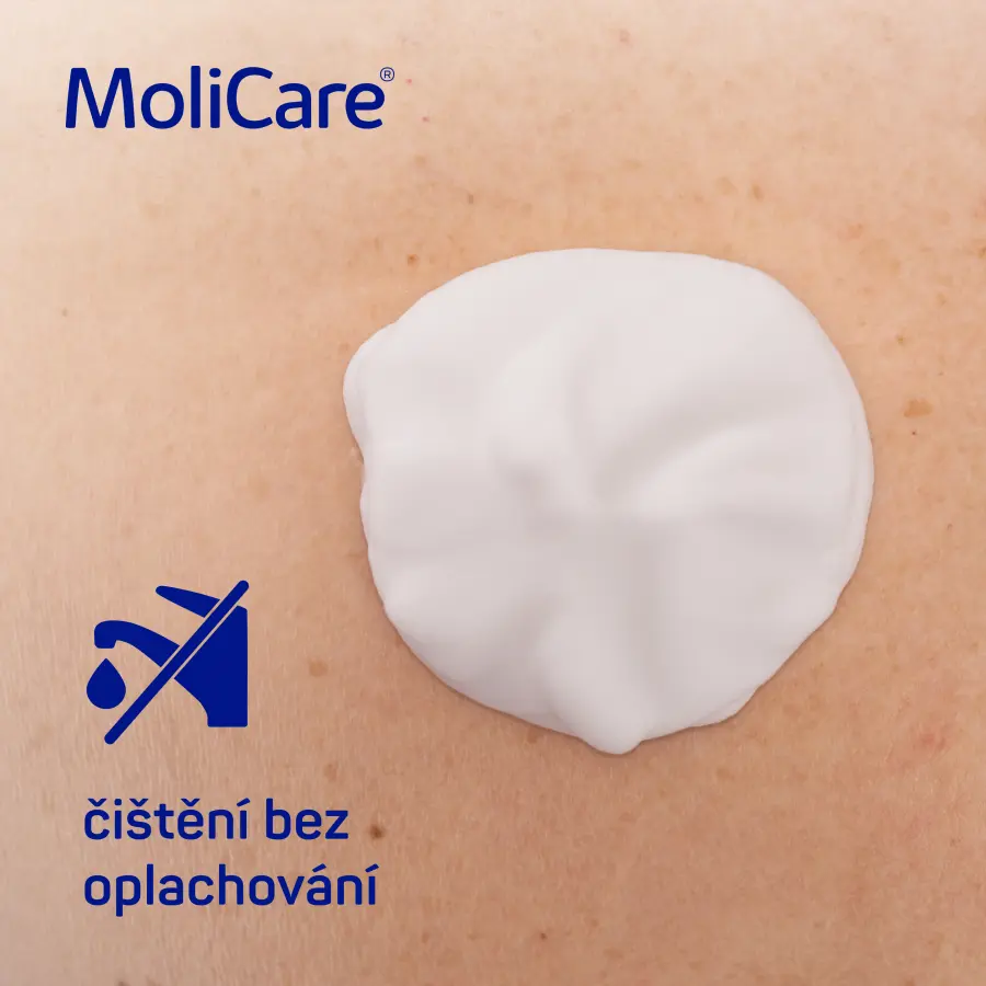 MoliCare® Skin Čisticí pěna je vůbec nejoblíbenější výrobek z čistící řady MoliCare® Skin pro péči o pokožku namáhanou inkontinencí. Slouží k rychlému a šetrnému očištění intimních partií po úniku moči nebo stolice, a to bez použití mýdla a vody. Použití přímo na lůžku je proto pro ošetřující osobu mnohem jednodušší. Dokáže účinně neutralizovat pachy, příjemně a svěže voní a obsahuje kreatin pro stimulaci vlastní funkce kožní bariéry. Lehká pěna se snadno rozpouští na kůži v mycí emulzi a následně roztírá pro jednoduché odstranění nečistot. Pěna má neutrální složení s vyváženým pH, které pomáhá pečovat o intimní partie, a je proto ideální pro rychlé a jemné čištění genitální a perineální oblasti i při fekální inkontinenci.