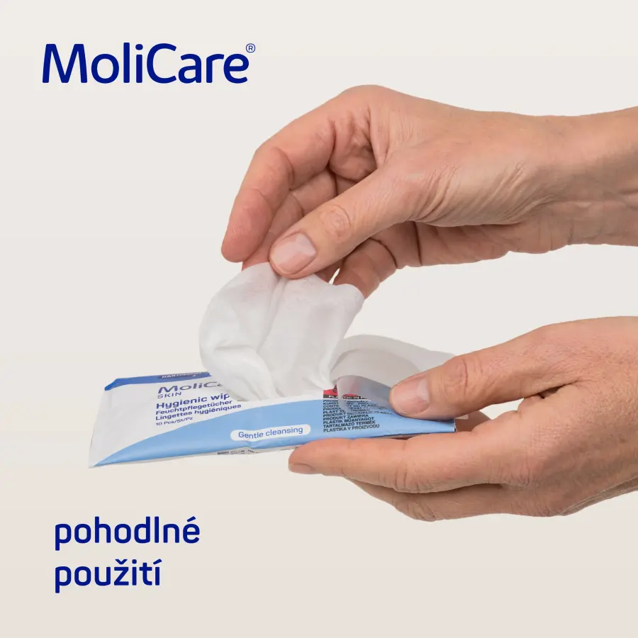 Hygienické ubrousky MoliCare® Skin jsou vhodné pro snadnou a rychlou hygienu nejen intimních partií a zároveň jako doplněk na sport či cestování. Speciální složení s pH 5,5 bylo vyvinuto pro citlivou pokožku a je navíc obohaceno o zklidňující heřmánek. Ubrousky jsou vhodné i jako doplněk pro ženy s lehkým únikem moči pro okamžité použití, kdykoli je potřeba.