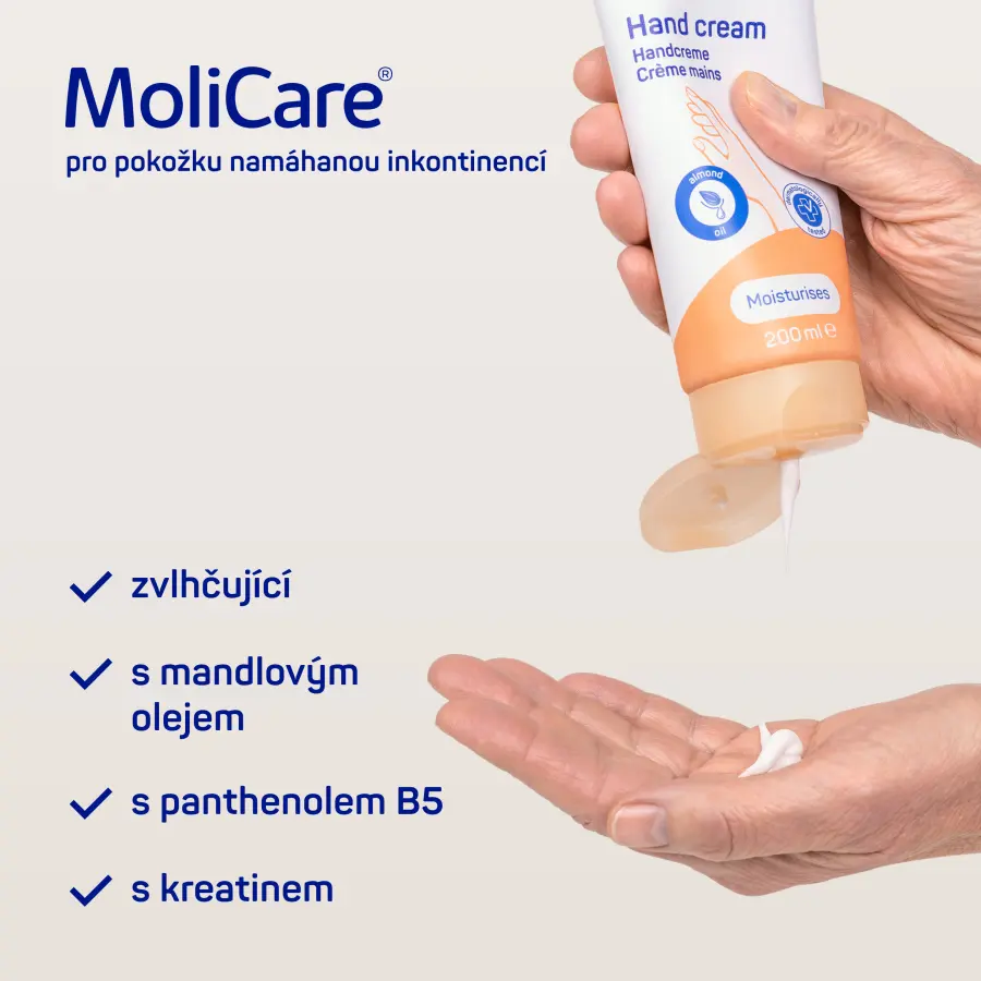 Krém na ruce MoliCare® Skin pečuje o namáhané a vysušené ruce. Svým složením vrací pokožce vlhkost a elasticitu. Rychle se vstřebává a nezanechává mastný film. Složení na bázi emulze typu „voda v oleji“ s panthenolem pokožku dlouhodobě a hloubkově hydratuje. Krém velmi příjemně a svěže voní.
