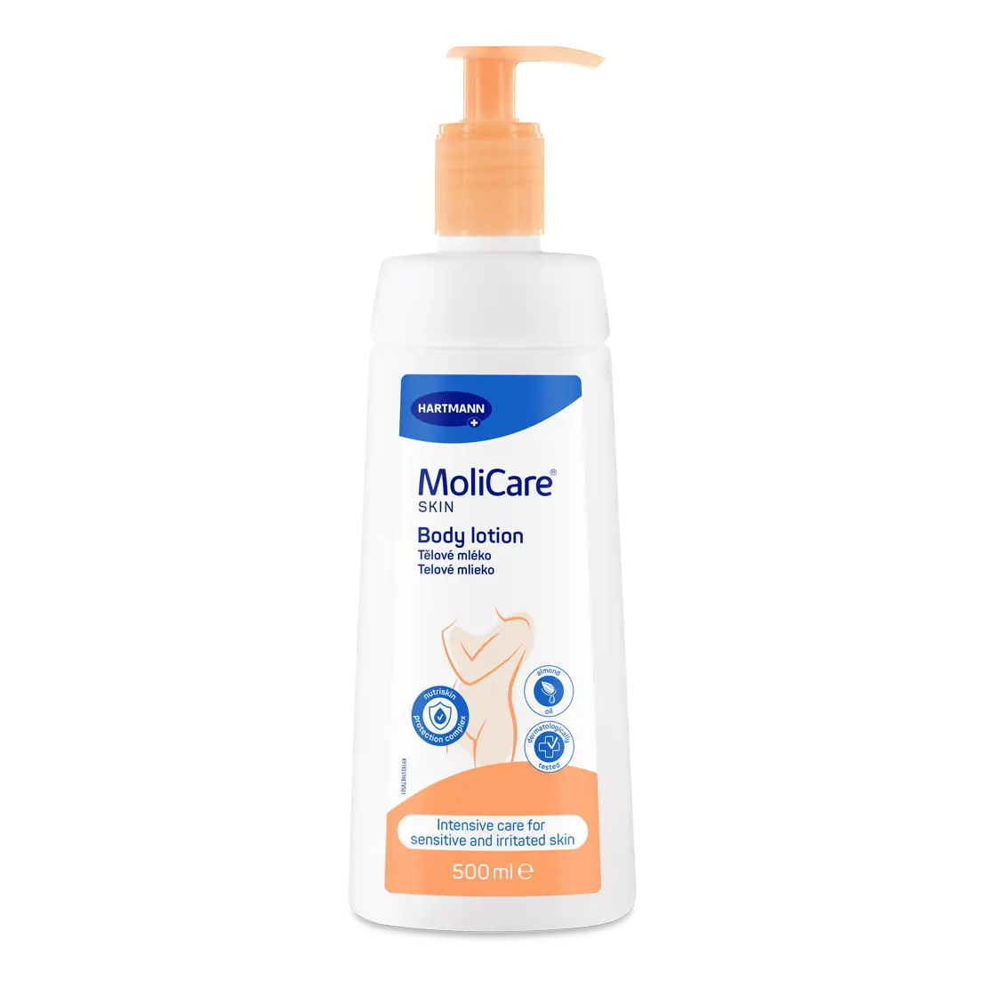 Tělové mléko MoliCare® Skin je součástí komplexní řady pro péči o citlivou a zralou pokožku, které dodá intenzivní péči a hydrataci.