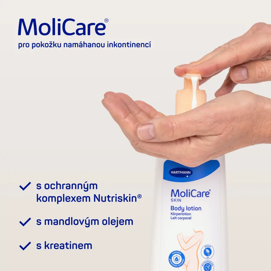 Tělové mléko MoliCare Skin k hydrataci pokožky celého těla je vhodné pro péči o zralou a citlivou pokožku. Díky kreatinu podporuje přirozené mechanismy ochrany pokožky. Silně hydratuje a chrání pokožku před škodlivými vlivy.