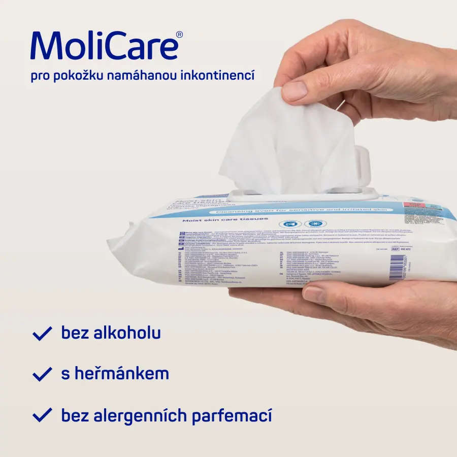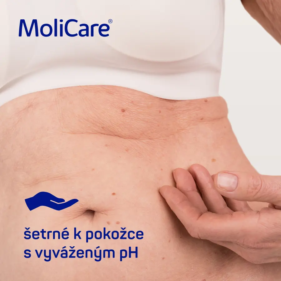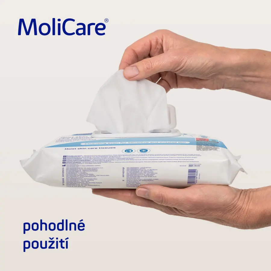 Vlhké ošetřovací utěrky MoliCare Skin slouží k rychlému a šetrnému čištění pokožky při inkontinenci. Účinně neutralizují zápach, příjemně a svěže voní. Utěrky mají pH 5,5 a díky němu nedráždí namáhanou pokožku v intimních partiích.