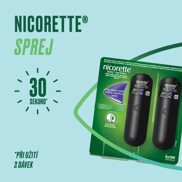 Orální sprej, roztok Nicorette® Spray 1 mg/dávka pomáhá zbavit se závislosti na kouření. Poskytuje rychlou úlevu od chuti na cigaretu již po 30 sekundách, při užití 2 dávek. Sprej má příjemnou příchuť máty, se kterou bude odvykání ještě snazší! Navíc je kapesní velikosti, díky čemu ho můžeš mít pořád po ruce, kdykoliv udeří nutkání zapálit si.