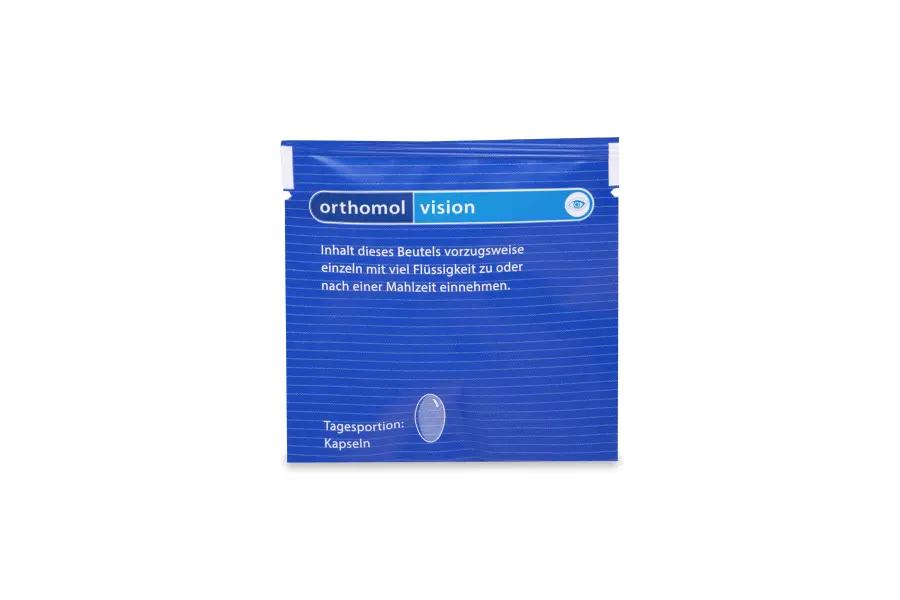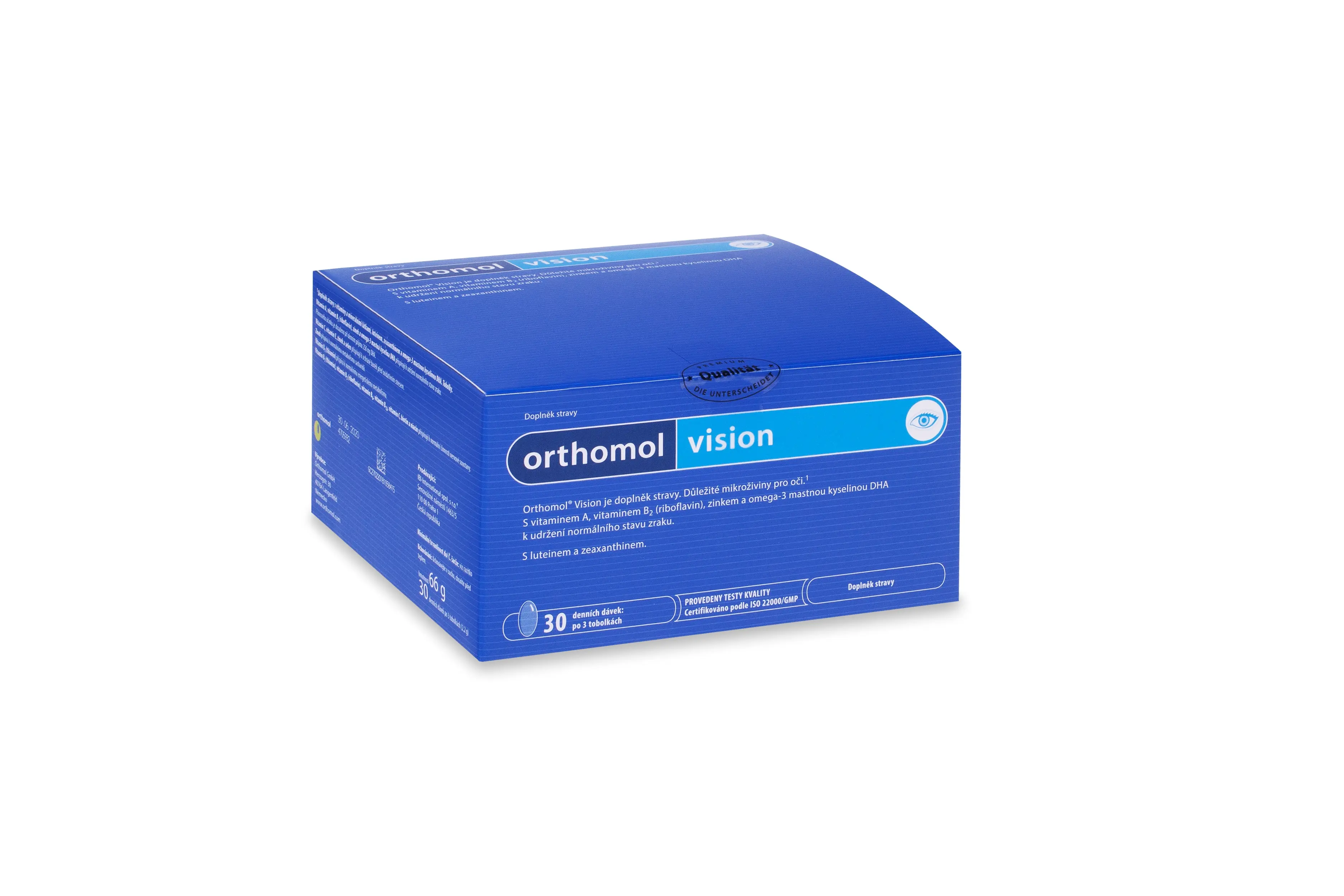 Orthomol® Vision je doplněk stravy. Obsahuje důležité mikroživiny pro oči. S luteinem a zeaxanthinem. Vitamin A, vitamin B2 (riboflavin), zinek a omega-3 mastná kyselina DHA přispívají k udržení normálního stavu zraku. Přínosného účinku je dosaženo při denním příjmu 250 mg DHA. Vitamin C, vitamin E, zinek a selen přispívají k ochraně buněk před oxidativním stresem. Vitamin B1 (thiamin), vitamin B2 (riboflavin), vitamin B6, vitamin B12, vitamin C, biotin a niacin přispívají k normální činnosti nervové soustavy. Zinek přispívá k normálnímu metabolismu sacharidů. Vitamin B1 (thiamin) přispívá k normálnímu energetickému metabolismu.