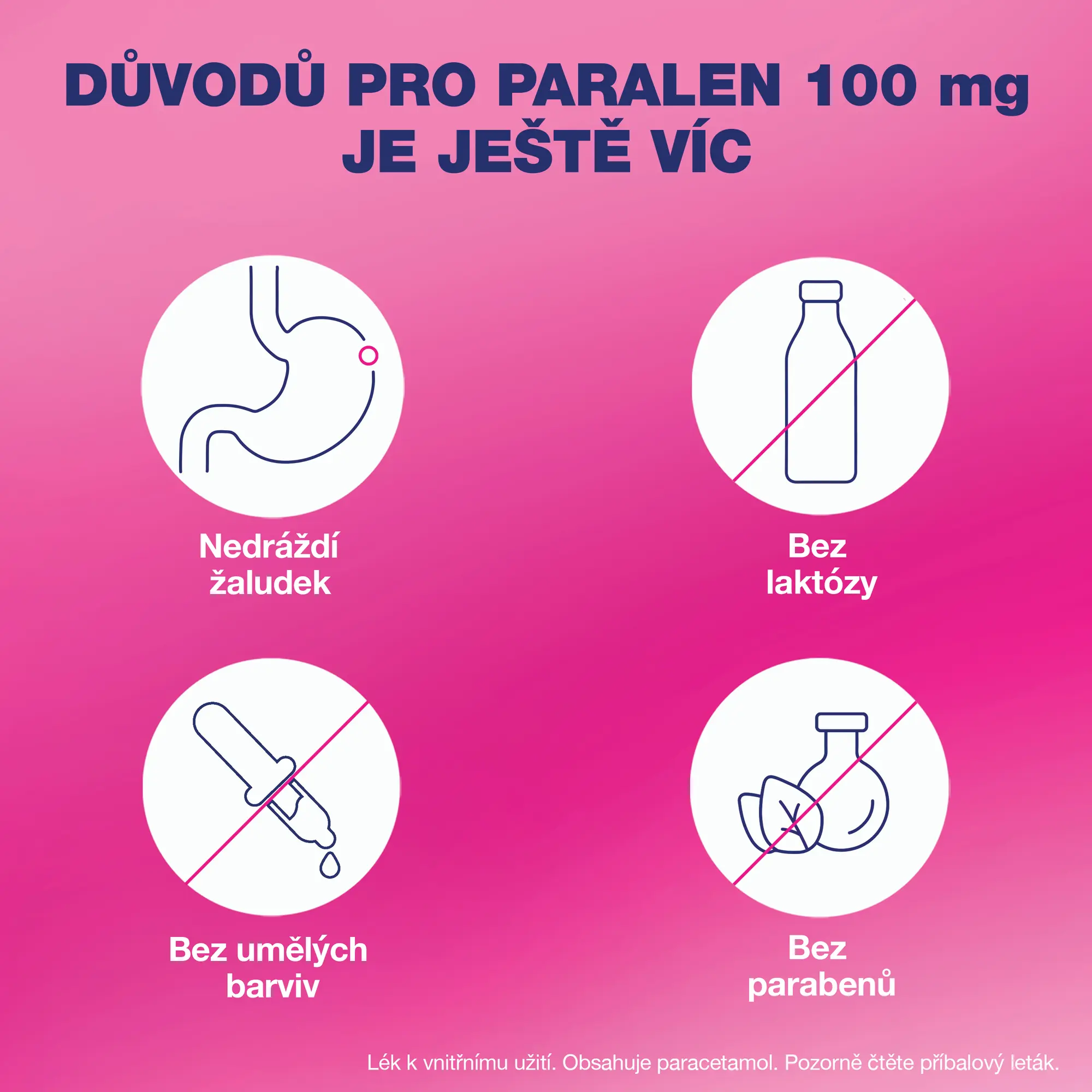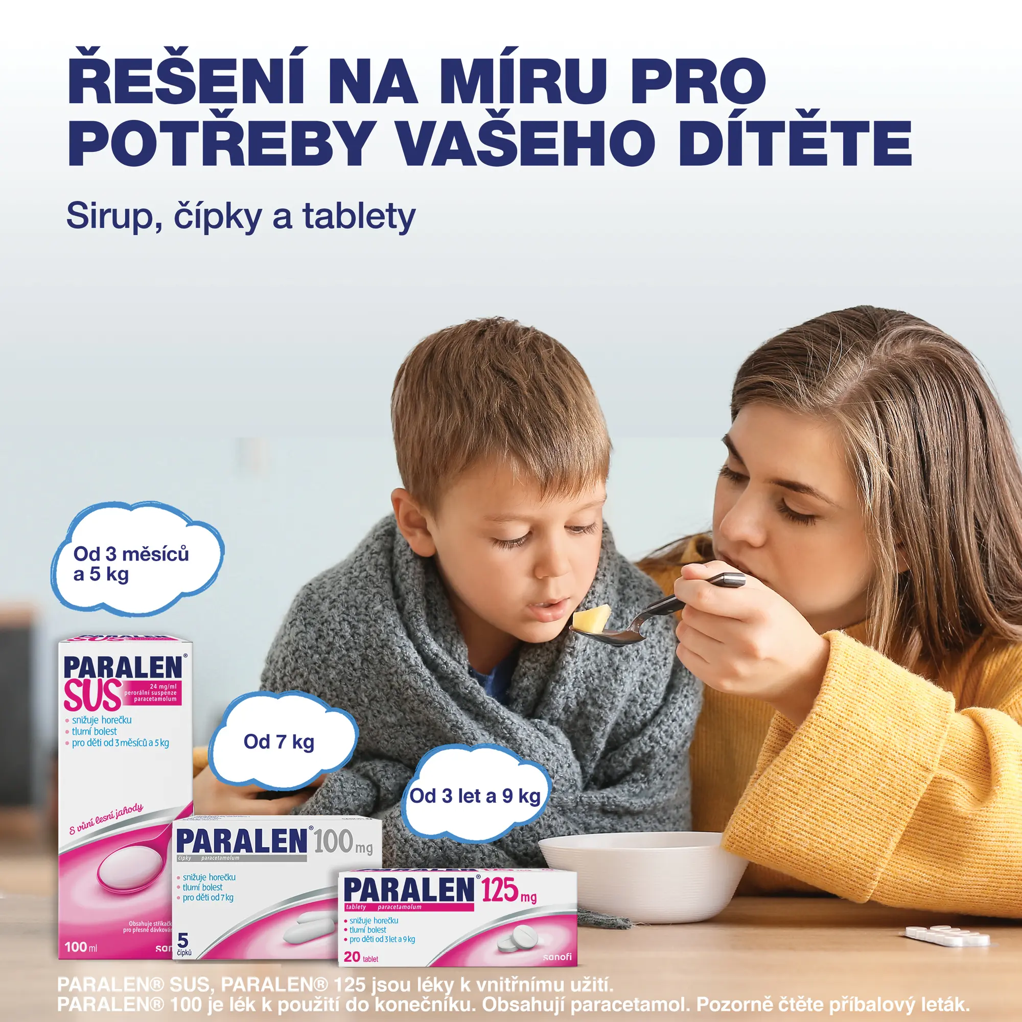 PARALEN® 100 je lék k použití do konečníku. PARALEN® SUS, PARALEN® 125 jsou léky k vnitřnímu užití. Obsahují paracetamol. Pozorně čtěte příbalový leták.