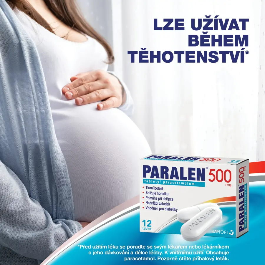 - V těhotenství lze PARALEN 500 mg tablety užít, je-li to nutné. Vždy zvolte co nejnižší dávku, která uleví od bolesti a/nebo sníží horečku, a užívejte ji co nejkratší dobu. Pokud potíže neustupují nebo potřebujete přípravek užívat častěji, kontaktujte lékaře.