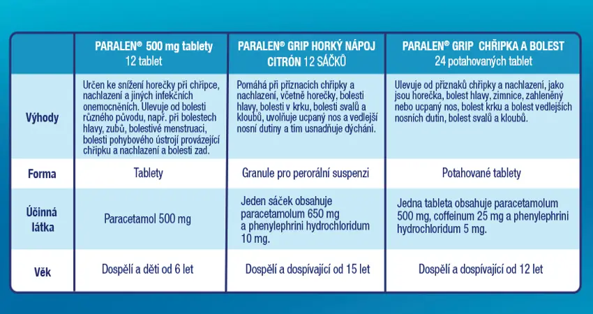 | Děti 6–12 let | 26–40 kg | 1/2–1 tableta PARALEN 500 mg (250–500 mg paracetamolu) | 4 tablety PARALEN 500 mg (2 g paracetamolu) |