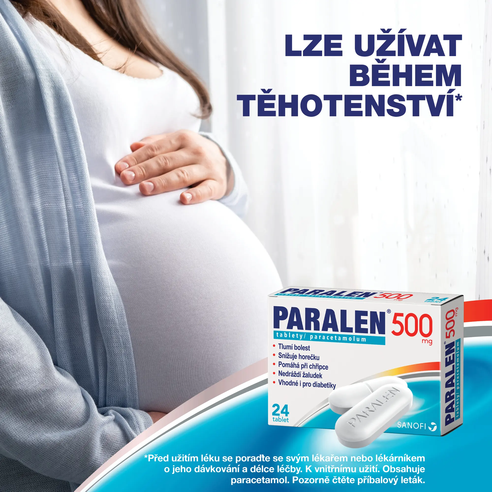 - V těhotenství lze PARALEN 500 mg tablety užít, je-li to nutné. Vždy zvolte co nejnižší dávku, která uleví od bolesti a/nebo sníží horečku, a užívejte ji co nejkratší dobu. Pokud potíže neustupují nebo potřebujete přípravek užívat častěji, kontaktujte lékaře.