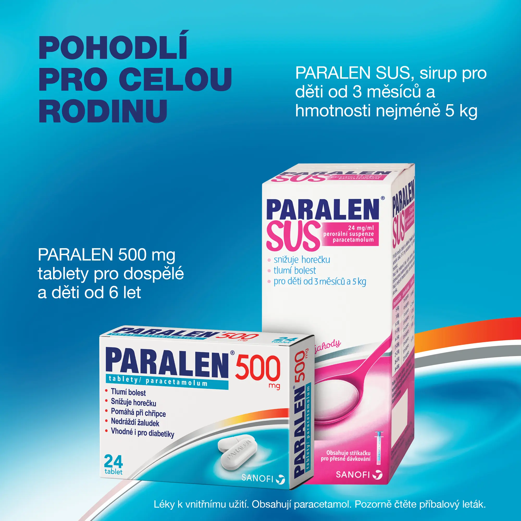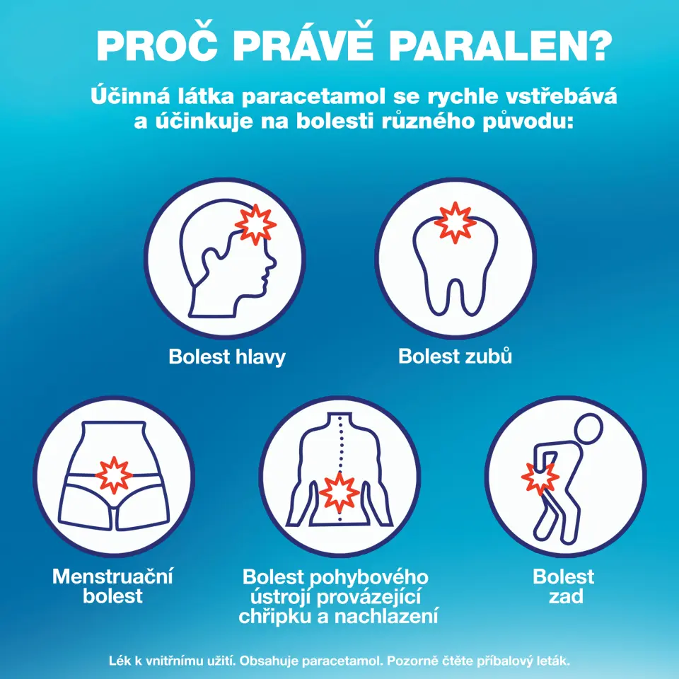Tablety PARALEN® 500 mg jsou určeny ke snížení horečky při chřipce, nachlazení a jiných infekčních onemocněních. Zároveň jsou vhodné při bolestech různého původu, například při bolestech hlavy, zubů, bolestivé menstruaci, bolestí zad a při bolesti pohybového ústrojí provázející chřipku a nachlazení.