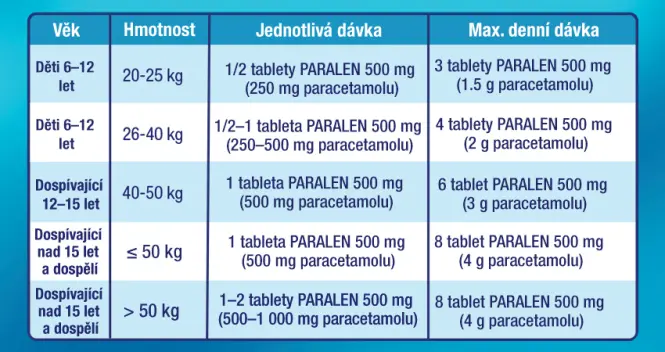 | Dospívající nad 15 let a dospělí | > 50 kg | 1–2 tablety PARALEN 500 mg (500–1 000 mg paracetamolu) | 8 tablet PARALEN 500 mg (4 g paracetamolu) |