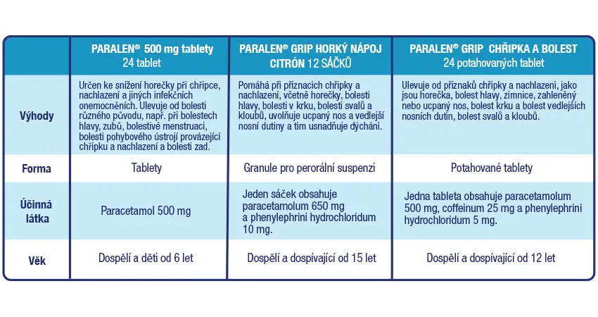 Paralen® 500, PARALEN® GRIP horký nápoj citrón, PARALEN®GRIP chřipka a bolest jsou léky k vnitřnímu užití a obsahují paracetamol. Pozorně čtěte příbalový leták.