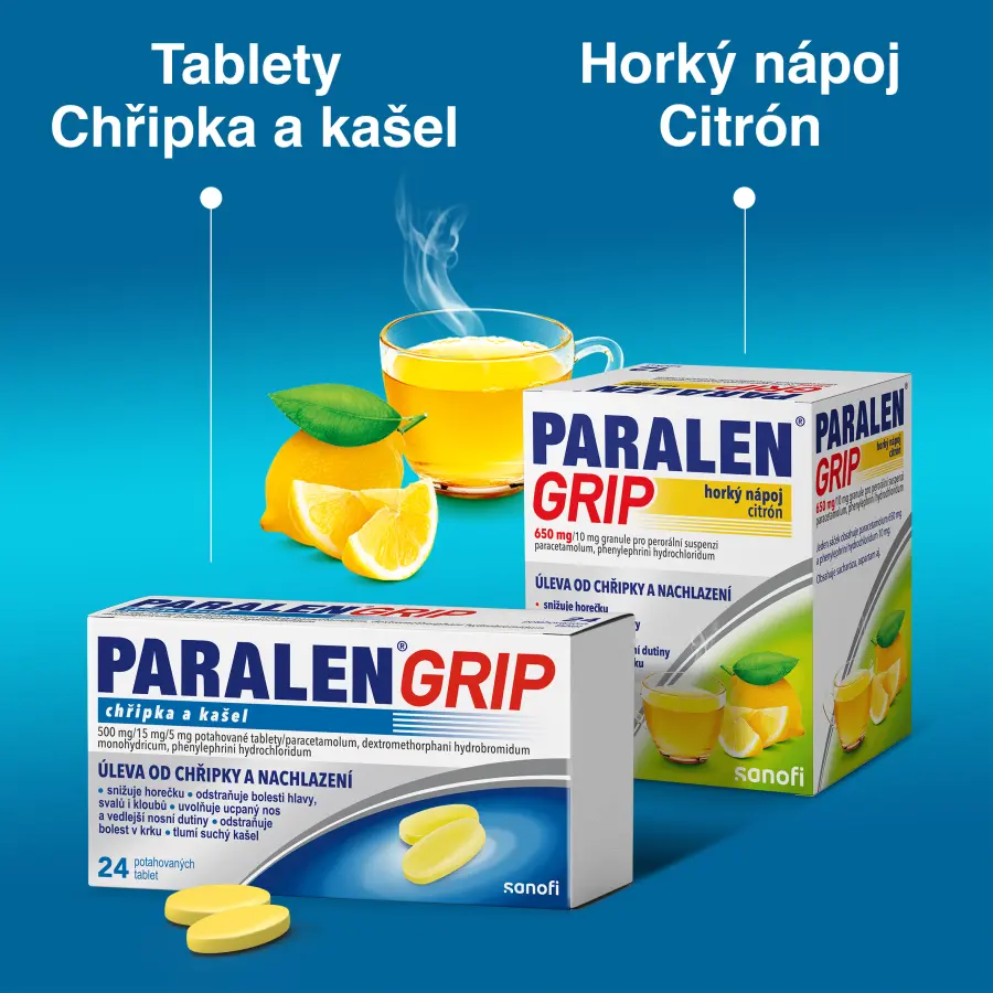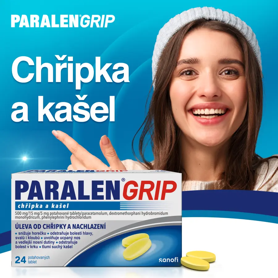 PARALEN® GRIP chřipka a kašel je určen k odstranění příznaků chřipky a nachlazení doprovázených suchým kašlem a ucpaným nosem. Přináší úlevu od horečky, bolesti hlavy, bolesti v krku, bolesti svalů a kloubů, suchého kašle, uvolňuje ucpaný nos a vedlejší nosní dutiny, a tím usnadňuje dýchání. V tabletách přípravku PARALEN® GRIP chřipka a kašel se příznivě uplatňuje kombinace paracetamolu (působí proti bolesti a horečce), fenylefrinu (uvolňuje dýchací cesty) a dextromethorfanu (tlumí kašel).