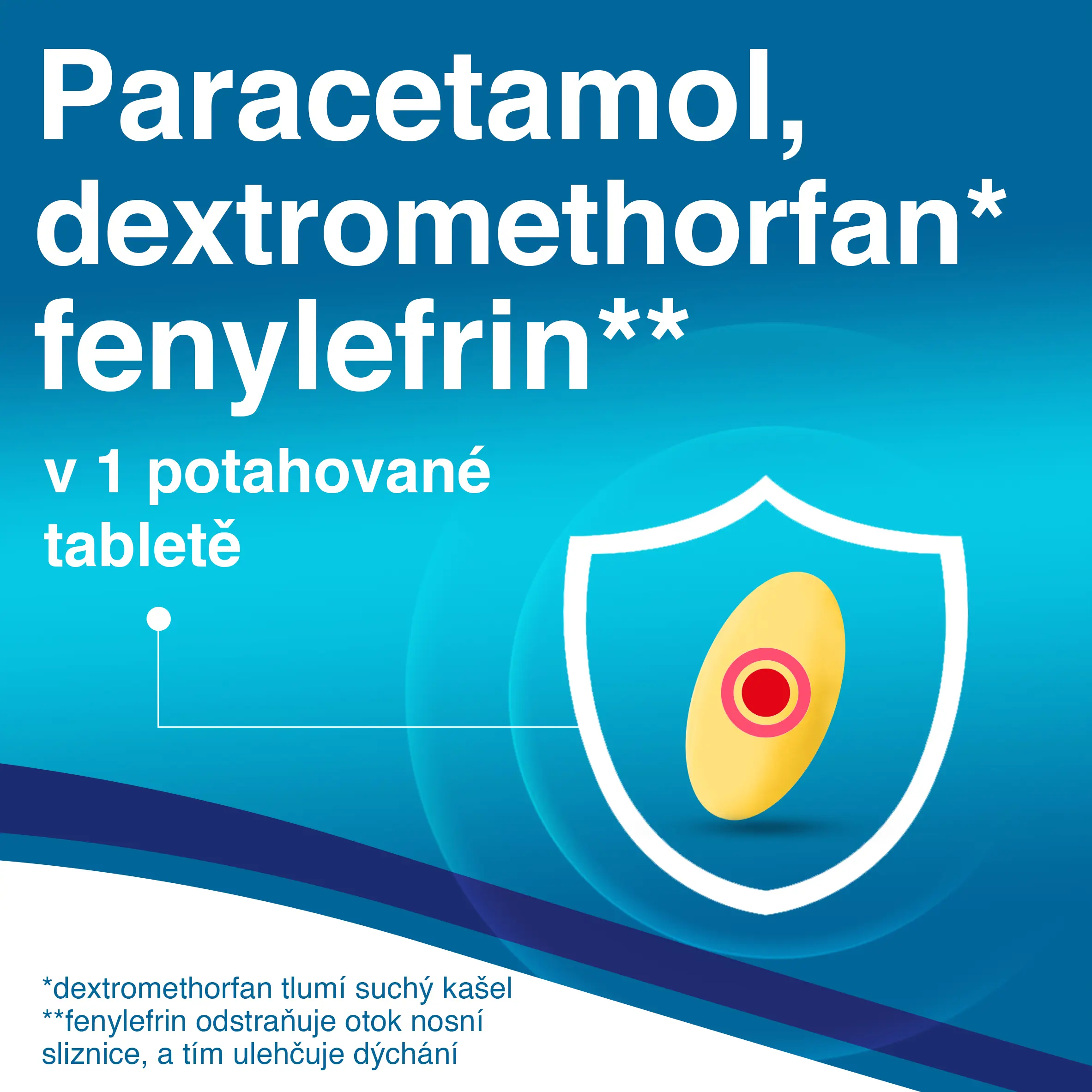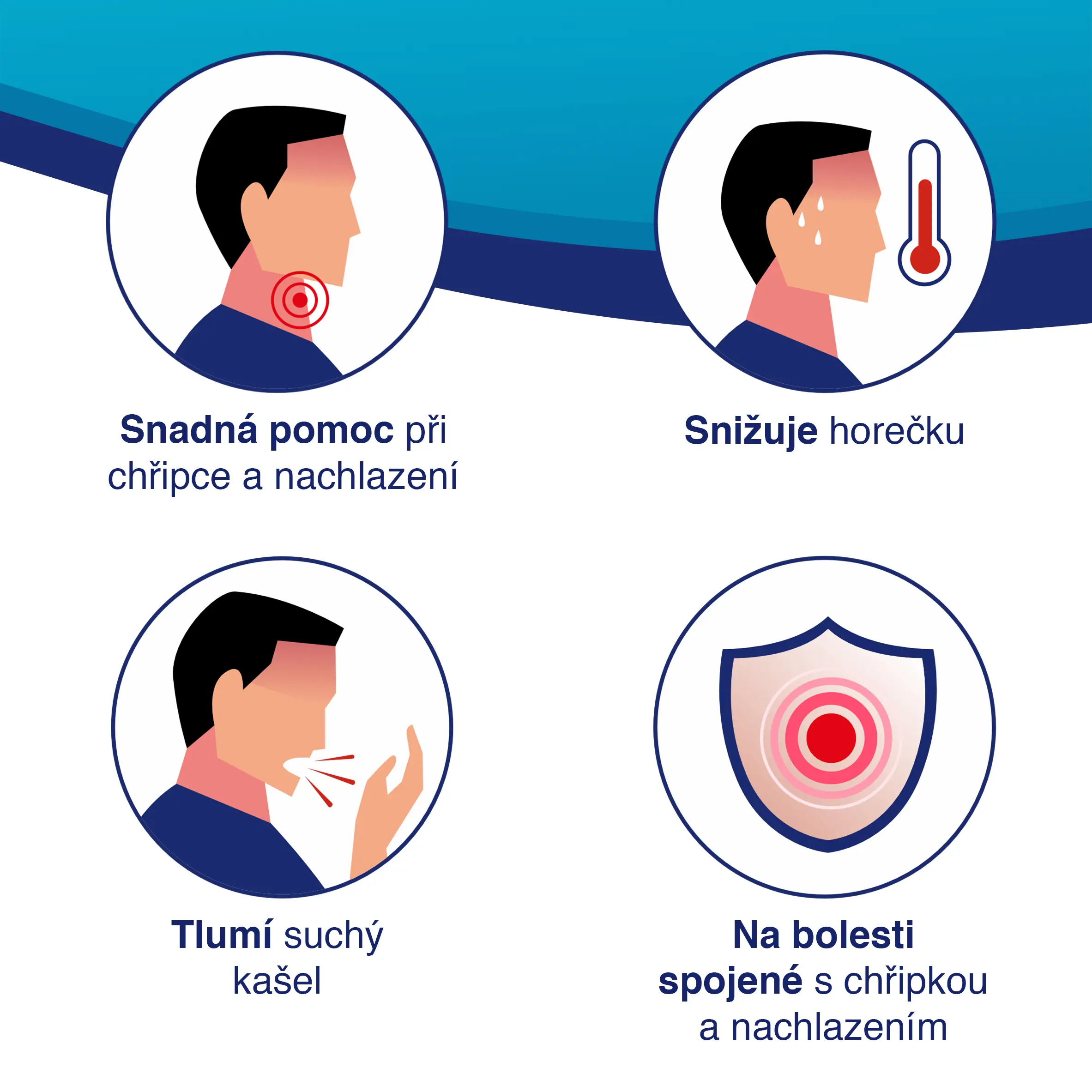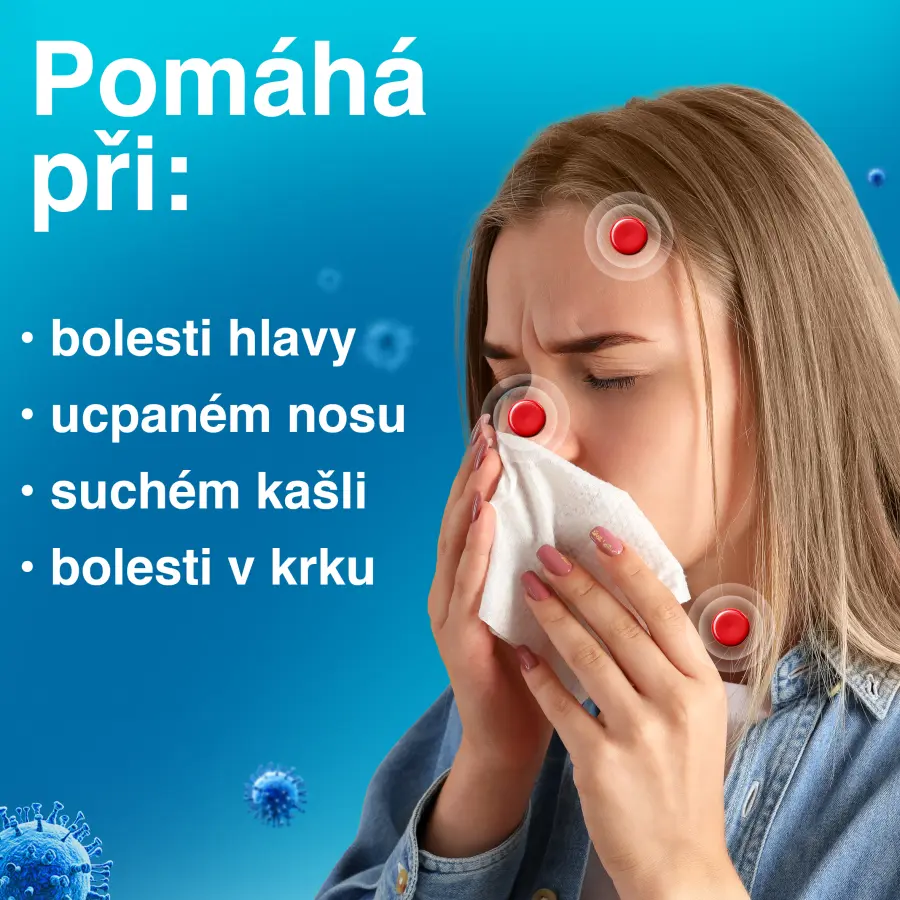 Odstraňuje příznaky chřipky a nachlazení, jako jsou: horečka, ucpaný nos, bolest hlavy, bolest v krku. Navíc tlumí i suchý kašel. Pro dospělé a dospívající od 12 let.