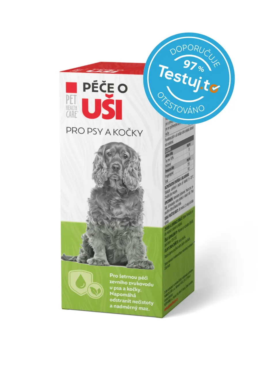 Pet Health Care Péče o uši je určen pro šetrnou péči zevního zvukovodu u psa a kočky. Odstraňuje nečistoty a nadměrný maz.