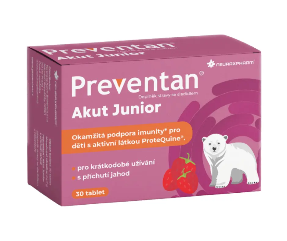 Preventan Akut Junior s aktivní látkou ProteQuine® a vitaminem C pro okamžitou podporu imunity u dětí a mladistvých. Ve formě cucavých tablet, určené k aktutnímu a krátkodobému užívání.