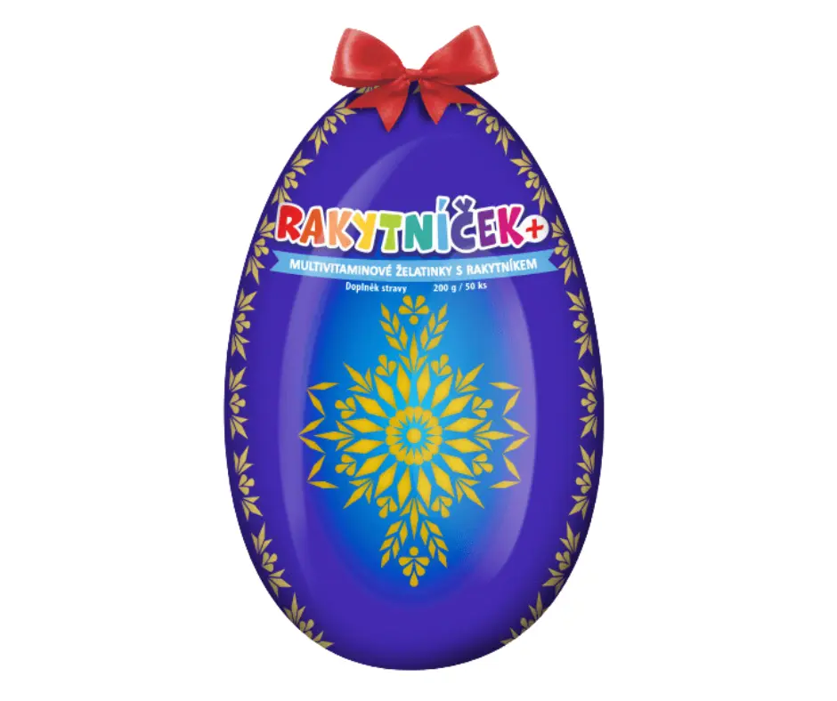 Ovocné želatinky s 20 % ovocné šťávy, vitaminy a rakytníkem v limitované velikonoční edici. Multivitaminové mlsání pro děti bez konzervantů, sladidel a přidaných barviv.