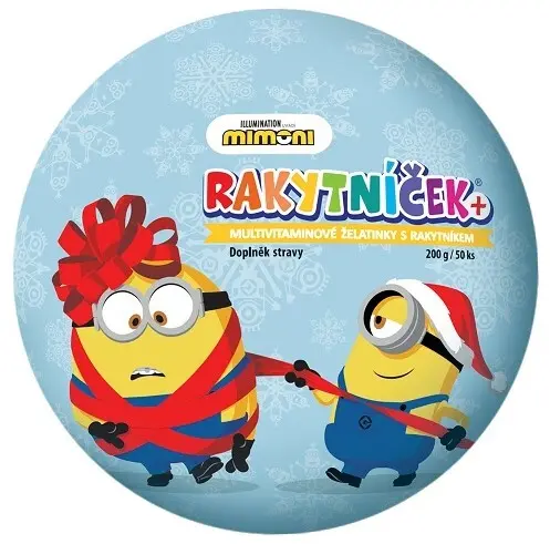 RAKYTNÍČEK+ želatinky Mimoni 50ks vánoční koule 2024 je vánoční edice ovocných želatinek s obsahem vitaminů pro děti. Želatinové bonbony obsahují 20% ovocné šťávy a 9 aktivních vitaminů a rakytník, kombinaci pro posílení dětské imunity. Rakytník řešetlákový podporuje obranyschopnost organizmu, snižuje únavu, podporuje činnost srdce a trávicího traktu, přispívá k udržování zdravé pokožky. Biotin napomáhá k normální funkci nervové soustavy a psychické činnosti, přispívá k udržování normálního stavu vlasů, sliznic a pokožky. Vitamin B12 napomáhá k normální tvorbě červených krvinek a funkci imunitního systému, ke snížení míry únavy a vyčerpání. Neobsahuje konzervační látky, umělá barviva a lepek.