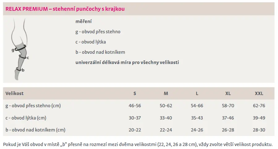 MAXIS RELAX PREMIUM stehenní punčochy s krajkou pomáhají předcházet vzniku cestovní trombózy, jsou vhodné při dlouhodobém sezení a stání, po lymfodrenáži anebo po kosmetickém zákroku na rozšířených kožních žilkách (pavoučí žíly – metličky). Jsou určeny všem ženám, které chtějí mít krásné, zdravé a lehké nohy bez žilek a otoků. Punčochy jsou charakteristické svým bezkonkurenčně jemným materiálem, který je úžasně měkký na omak. Přes svou jemnost je dokonale pevný. Díky vysoké elasticitě vláken jsou punčochy nabízeny v univerzální délkové míře a skvěle padnou.