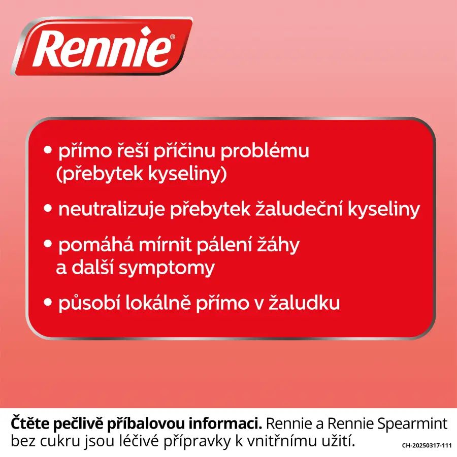 Rennie je osvědčený léčivý přípravek na pálení žáhy. Je to tzv. antacidum, které neutralizuje přebytek žaludeční kyseliny na vodu a další tělu přirozené látky. Rennie řeší přímo příčinu problému – nadbytek kyseliny v žaludku – a pomáhá tak mírnit její nepříjemné symptomy, jako je pálení žáhy. Působí přímo v žaludku a tedy lokálně.