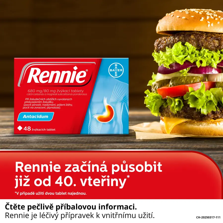 Rennie přináší velmi rychlou a efektivní úlevu! Rennie je lék, který se užívá při překyselení žaludku a tím vyvolaných žaludečních obtížích, zejména pálení žáhy.