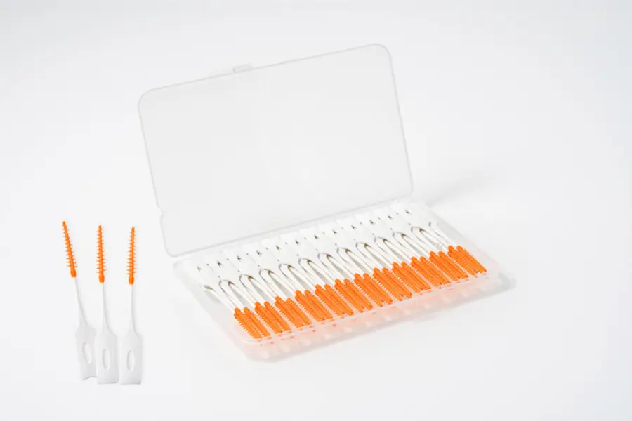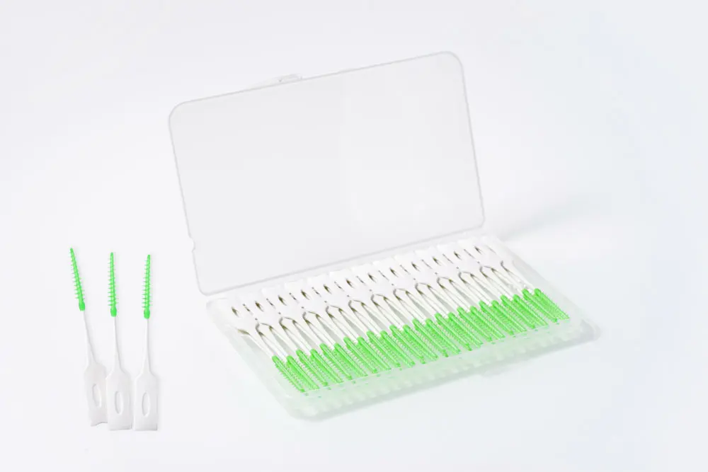 Jednorázové dentální párátko s kartáčkem z flexibilního materiálu, 2 v 1 – mezizubní kartáček a dentální párátko.