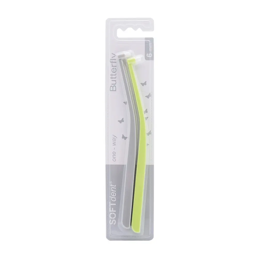 SOFTdent Butterfly solo kartáček má extra jemná vlákna a krátký zástřih, je určen pro čištění jednotlivých zubů.