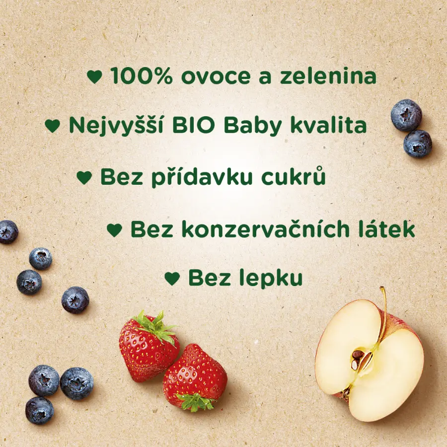 Jablkové pyré1 77 %, jahodové pyré1 20 %, borůvkové pyré1 3 %. Bez lepku. 1 z ekologického zemědělství.