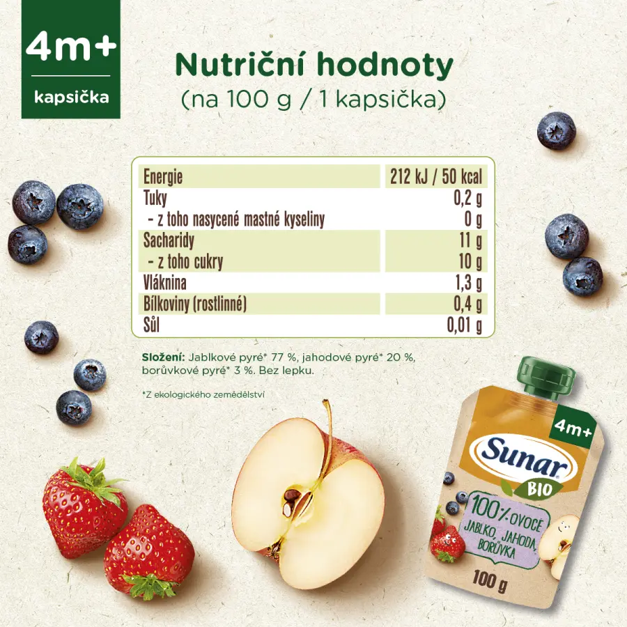 Sunar BIO ovocná kapsička jablko, jahoda, borůvka 4m+, 100 g