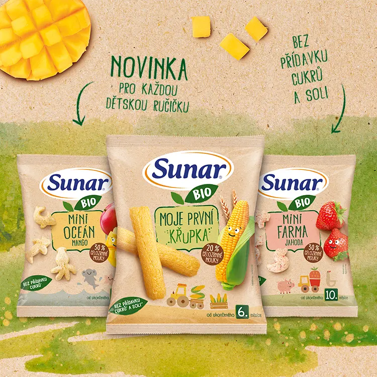 Křupky určené pro děti od ukončeného 6. měsíce. Obsahují až 20 % celozrnné cereální mouky.