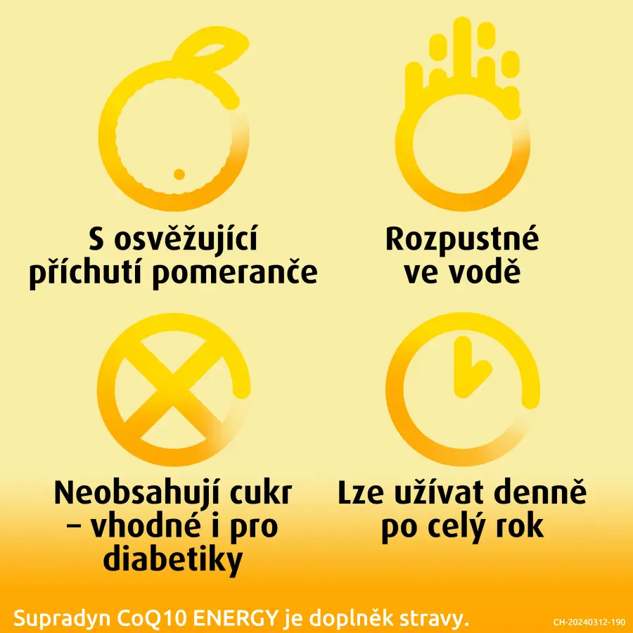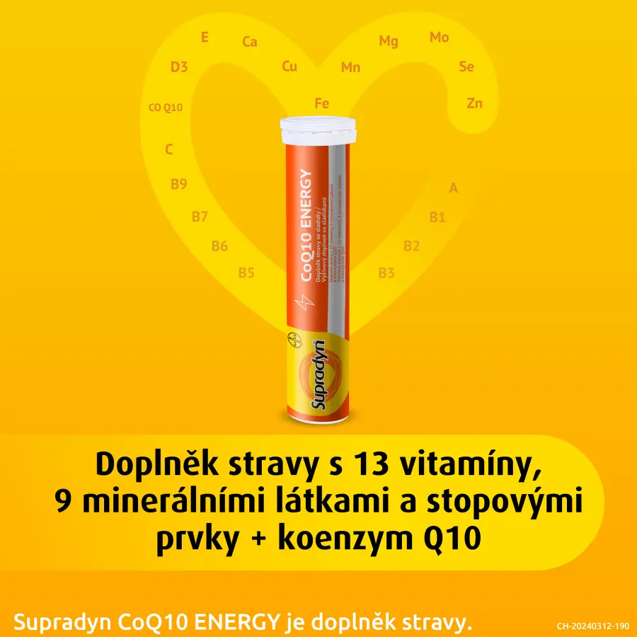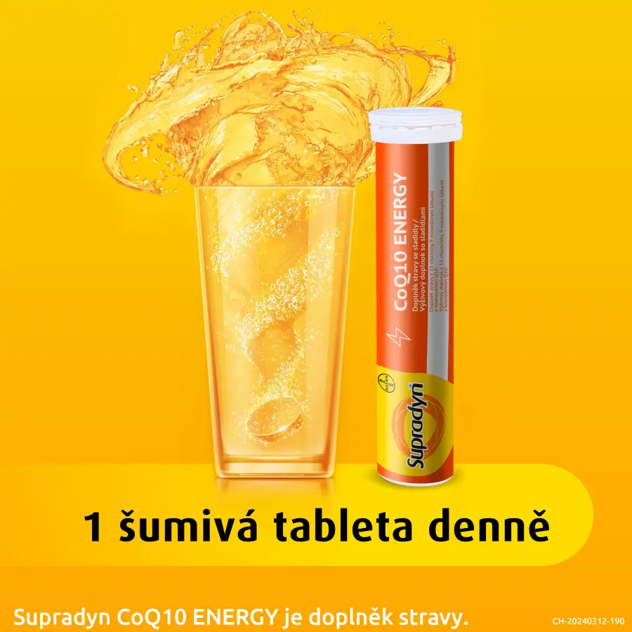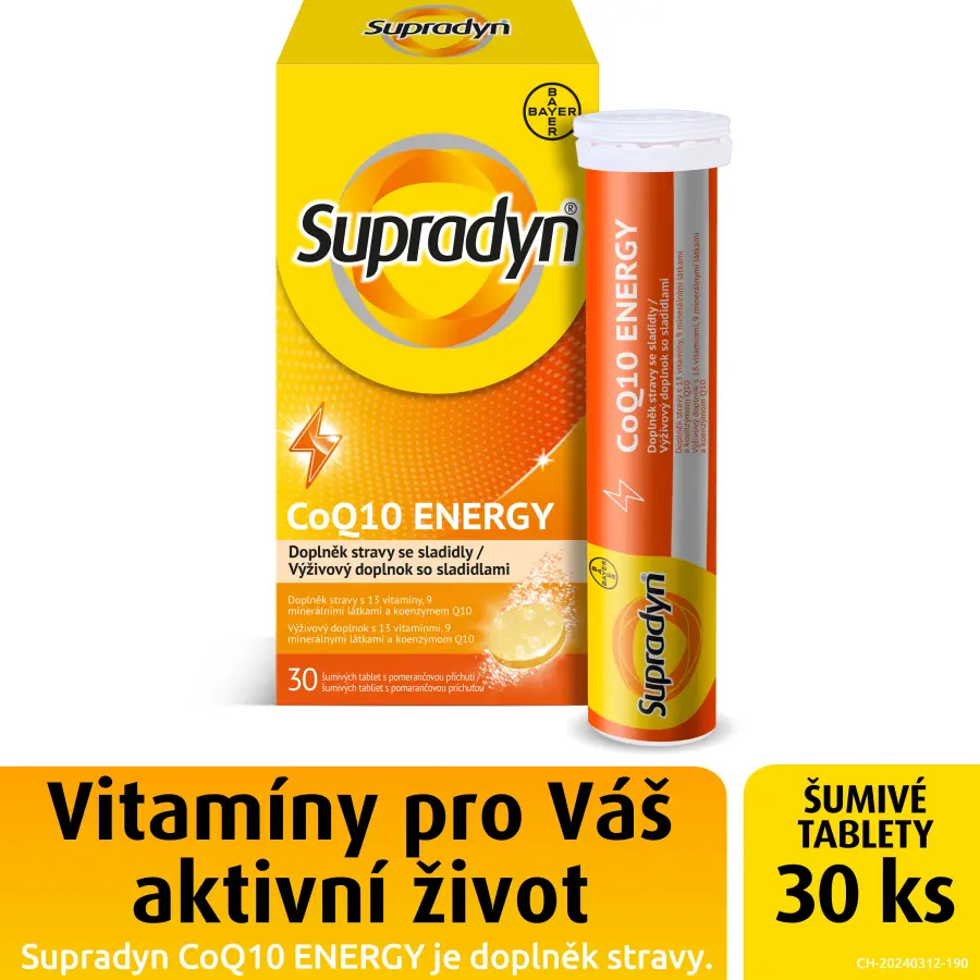 Supradyn CoQ10 ENERGY je multivitaminový doplněk stravy pro udržení optimální hladiny vitaminů a minerálů, které pomáhají využít potřebnou energii. Supradyn CoQ10 ENERGY obsahuje vitaminy, minerály a stopové prvky se speciálně dávkovaným komplexem vitaminů skupiny B, vitaminu C, hořčíku a vápníku. Supradyn CoQ10 ENERGY obsahuje kromě vitaminů a minerálů také koenzym Q10. Koenzym Q10 je obsažen v každé buňce lidského těla a podporuje přeměnu a využití energie.