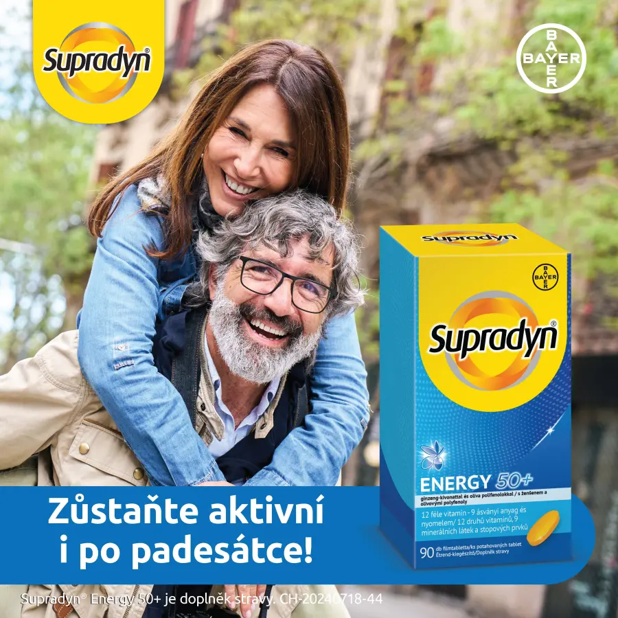 Supradyn ENERGY 50+ je doplněk stravy s obsahem komplexu vitamínů vyvinutých pro osoby starší 50 let. Obsahuje vitamíny B2, B3, B5, B12 a C, foláty, hořčík a železo.