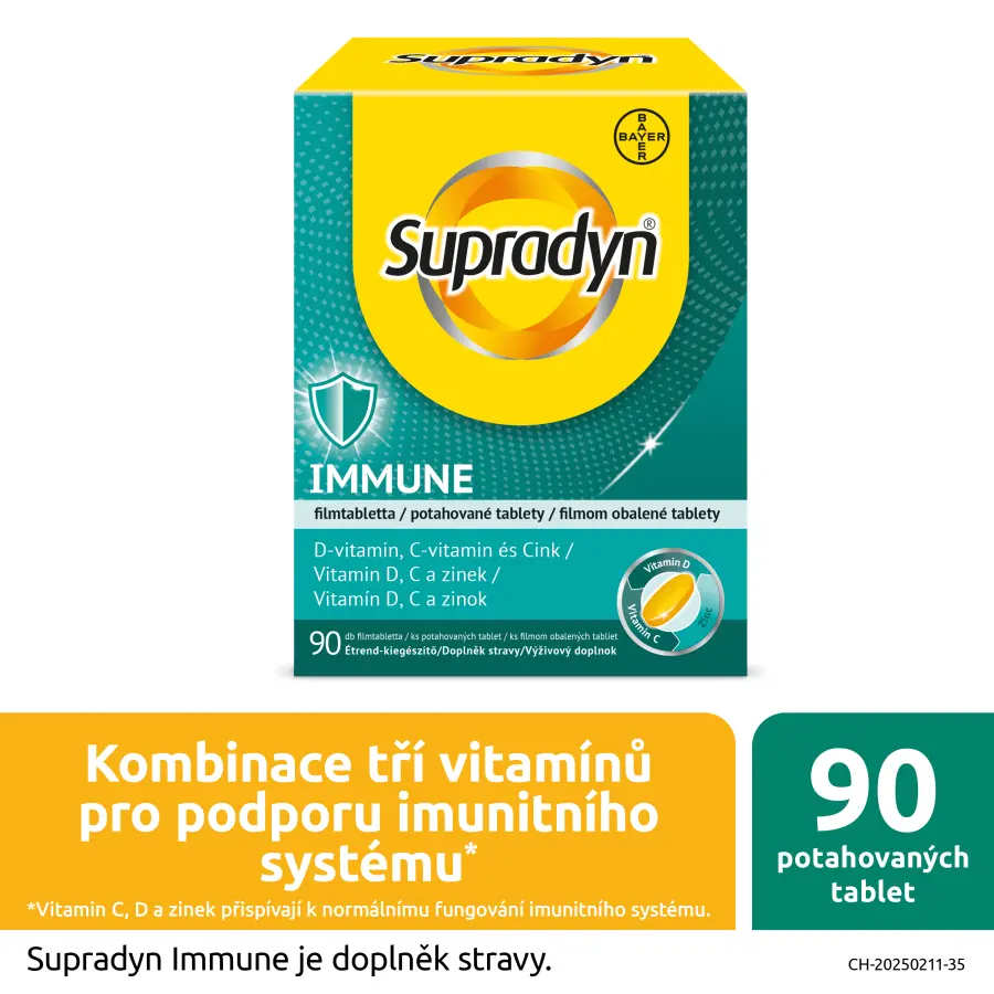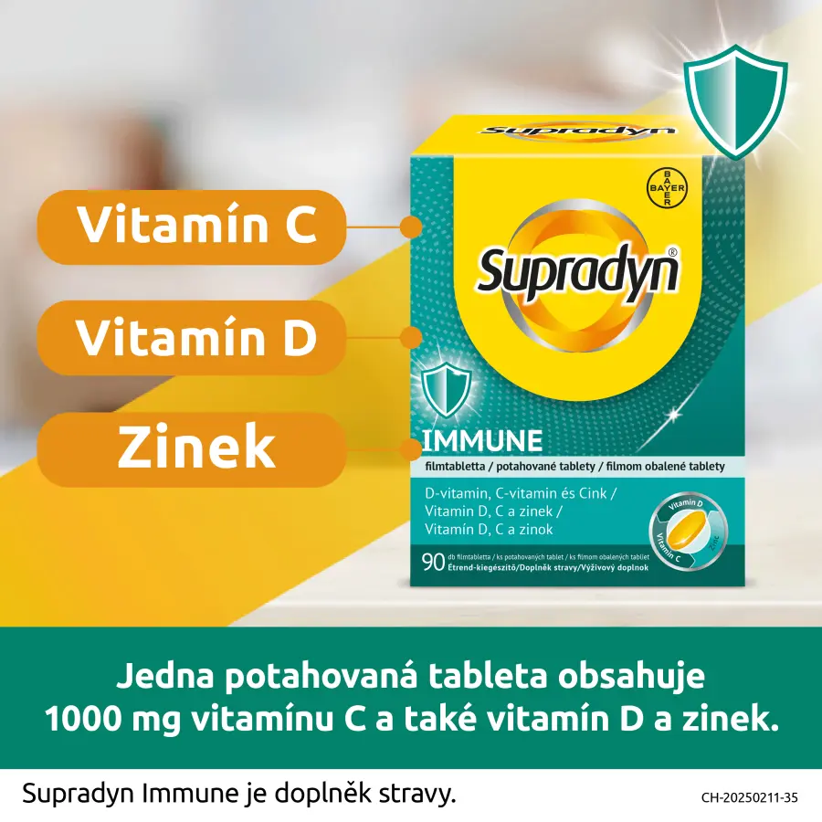 Podpořte svou imunitu v podzimním a zimním období. Supradyn Immune, doplněk stravy s vysokou dávkou vitamínu C, s vitamínem D a zinkem. Pro Vaši Imunitu.