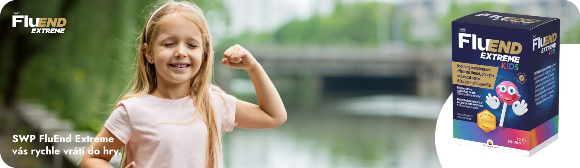 SWP Fluend Extreme Kids lízátka s vitaminem C, medem a rostlinnými extrakty. Heřmánek pravý přispívá ke zklidnění krku, hltanu a hlasivek. Vitamin C podporuje imunitní systém a třapatkovka nachová přispívá k normální funkci dýchacího systému.